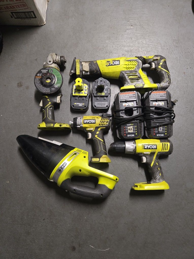 Saw saw, impact driver, drill, grinder, vacuum cleaner 2 batteries and 2 chargers.