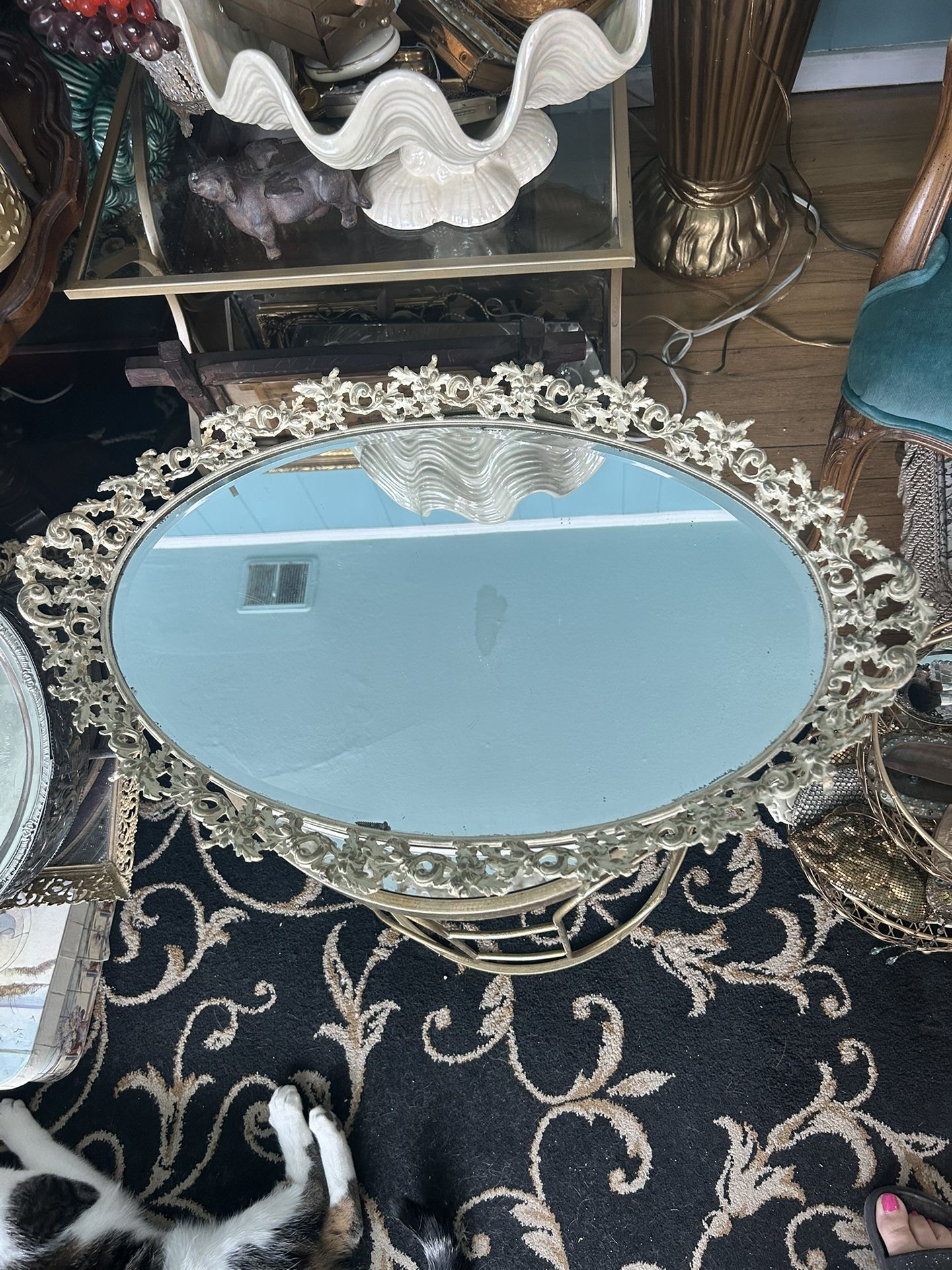 Beautiful large vintage oval mirrored vanity tray. Ivory with gold accents. 25x16”