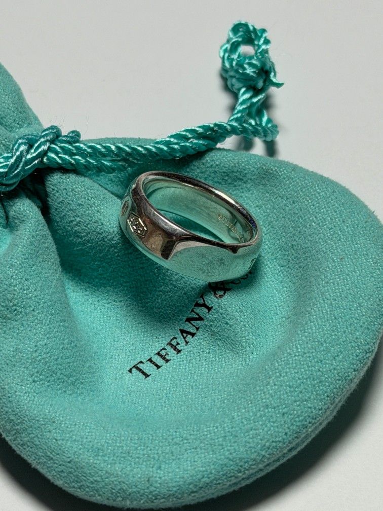 This stunning Tiffany & Co. sterling silver signet ring features the classic Makers design — a bold, flat top that’s perfect for engraving or wearing as a standout piece on its own. Crafted from high-quality sterling silver and inspired by Tiffany’s long legacy of expert craftsmanship, this piece embodies timeless elegance with everyday wearability. Originally retailed for $1050.00 Key Features: • Material: Genuine sterling silver (high-polish finish) • Design: Flat signet top with the iconic Makers mark — a symbol of Tiffany & Co.’s heritage and craftsmanship Tiffany & Co. US • Style: Classic and bold — perfect for personal engraving or statement style • Wear: Great as a standalone statement ring or as part of a curated ring stack This ring offers both collectible appeal and everyday sophistication — a true standout for any jewelry collection. Condition: Gently used and in great condition — ready to wear!