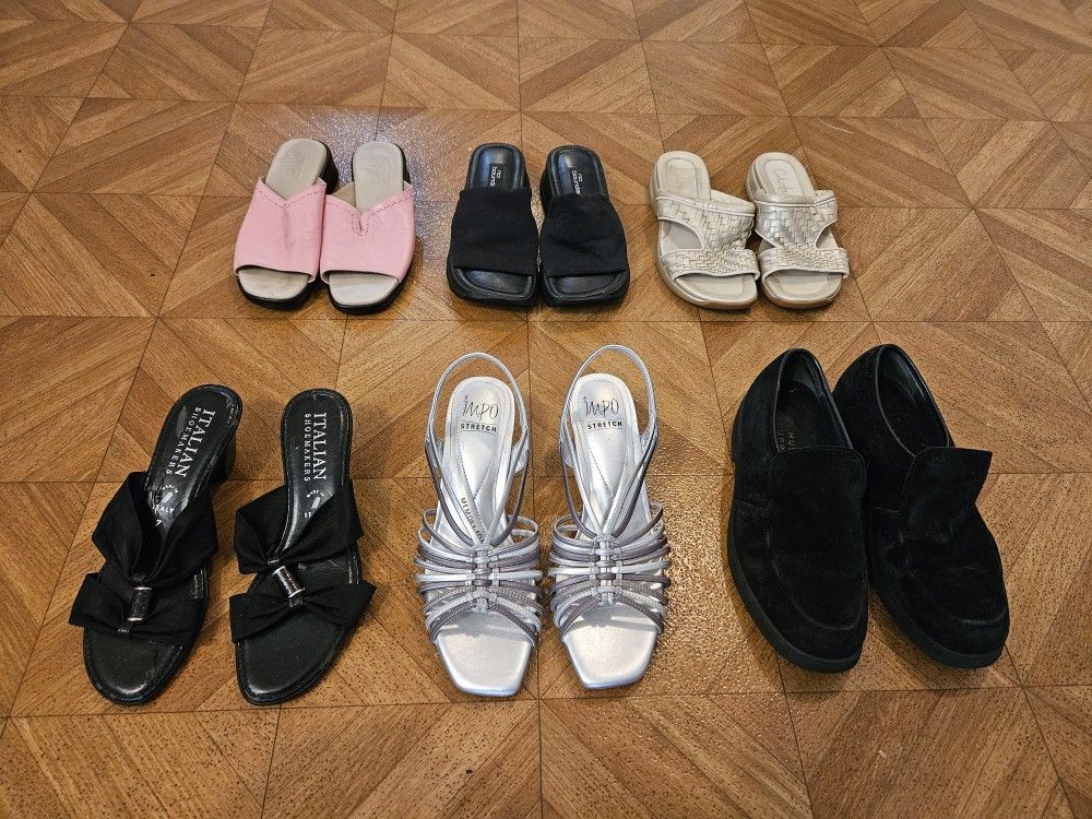 Women's Shoes. $20 each pair Top Row - from left to right: Munro American slides - slip on wedge sandals Color: Pink Size: 6-1/2 M Features: Shock Absorbing Heel munro-Tech "Perfect size, Perfect fit" No Boundaries slides - slip on wedge sandals Color: Black Size: 6-1/2 M Fabric Upper Bal Man Made Material Marilyn 1-Band Stretch (You can find another online seller is selling these for $24 + s/h - screenshot available of this pricing.) Cole Haan slides - slip on wedge sandals Color: Gold Size: 6-1/2 B Nike Air Bottom Row - from left to right: Italian Shoemakers slip on wedge heels Color: Black Size: 7 Made in Italy Impo slingback heels Color: Silver Size: 8-1/2 Eden Impo Stretch Memory Foam Textile/Manmade Upper Balance Manmade Materials (You can find another online seller is selling these for $21.88 + $9.31s/h - screenshot available of this pricing.) Hush Puppies loafers Color: Black Size: 7-1/2 M Leather Upper 55010 Additional photos available. I also have men's shoes, men and women's clothing, bags and accessories. If you follow me on this app or click my profile icon, you can see the items I have for sale. Cash only. No shipping available. Item to be picked up at my location in Sunset Beach. Selling as is, as shown. Shoes may show signs of slight use. No refunds. Selling first come, first serve. casual shoes, sling backs, comfort loafers, summer sandals, dress sandals, sandles, moccasins, slipons, slipins, boots, womens, woman, tread, high-end footwear, medium, half, outsoles, rubber, plastic, great condition, new, like new, rarely worn, gold metallic, white, black, aruba pink, clothing accessories, toes, work, cushions, cushioned, weaves, criss-cross, criss cross, crisscross, grey, gray, tan, beige, cords, ties, shoelaces, buckles, straps, strappy, lightweight, breathable, velvet, suede, platform shoes, chunky wedges, y1k, 2000s, millennium, cocktail parties, party, wedding, birthdays, anniversarys, anniversaries, celebrations, events, slides, flats, block heels