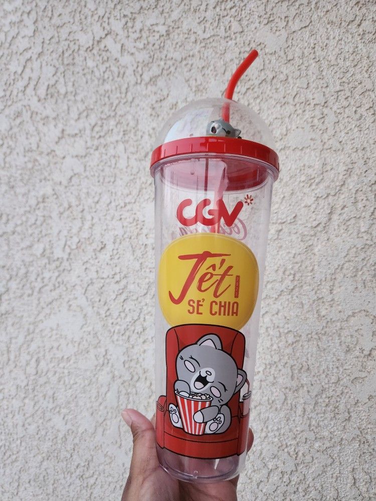 CGV cinema souvenir tumbler cup featuring a cute character design for the Tết holiday promotion. The cup has red lid and straw. It features a cartoon character sitting on a red armchair, holding a box of popcorn. The text on the cup is in Vietnamese and promotes the Tết holiday. It features the classic red Coca-Cola logo. The design includes two graphic swallows and text that appears to be "Nông Hâu" in a gold-toned font. The cup is designed for cold beverages and includes a secure lid and reusable red straw.