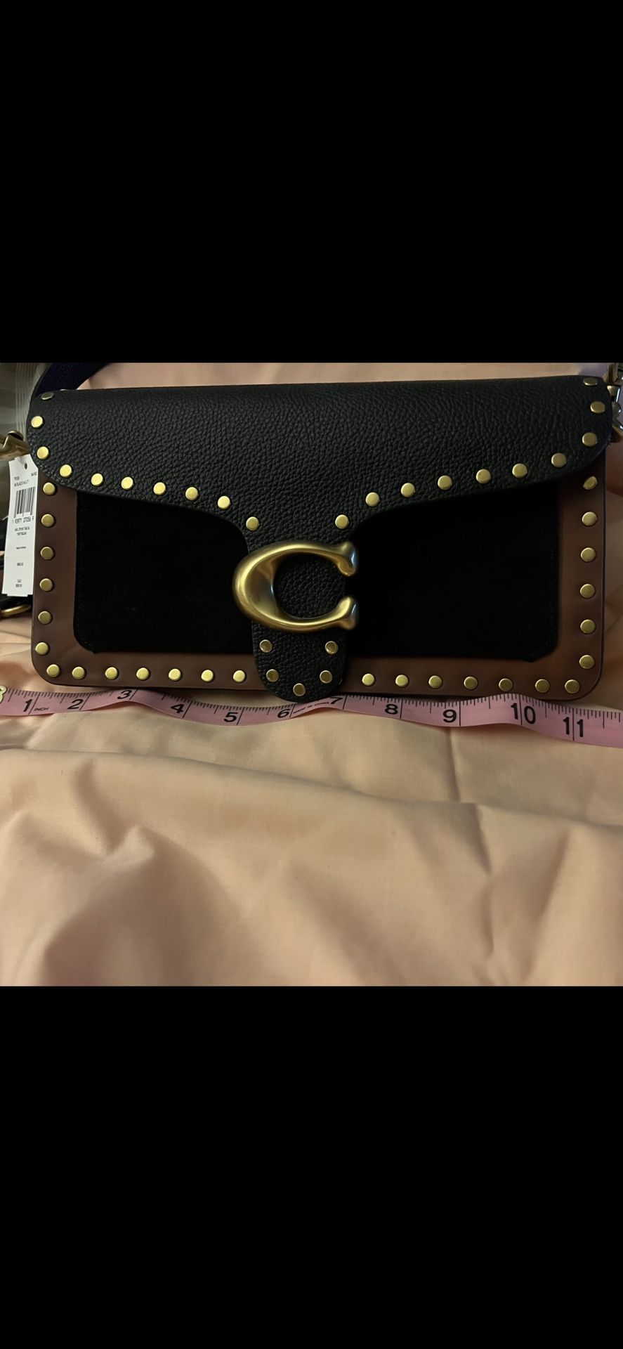 BRAND NEW Bag is multicolor with black, brown, tan as the primary colors but with mix textiles. Leather is pebble grain, smooth leather in black, brown, tan. Suede from outside to the inside is black and dark brown (looks burgundy in picture). It has brass rivets on the perimeter, outlining the bag as well as the flap of the bag. The C-COACH emblem opening of the bag is substantial and is also in brass. Helps keep the bag closed at all times. It is crossbody, comes with two straps, one for shoulder length carry and one for crossbody length carry. Still has plastic & paper protective inserts, magnetic closure. Brass Hardware. MAKE ME AN OFFER I CAN’T REFUSE