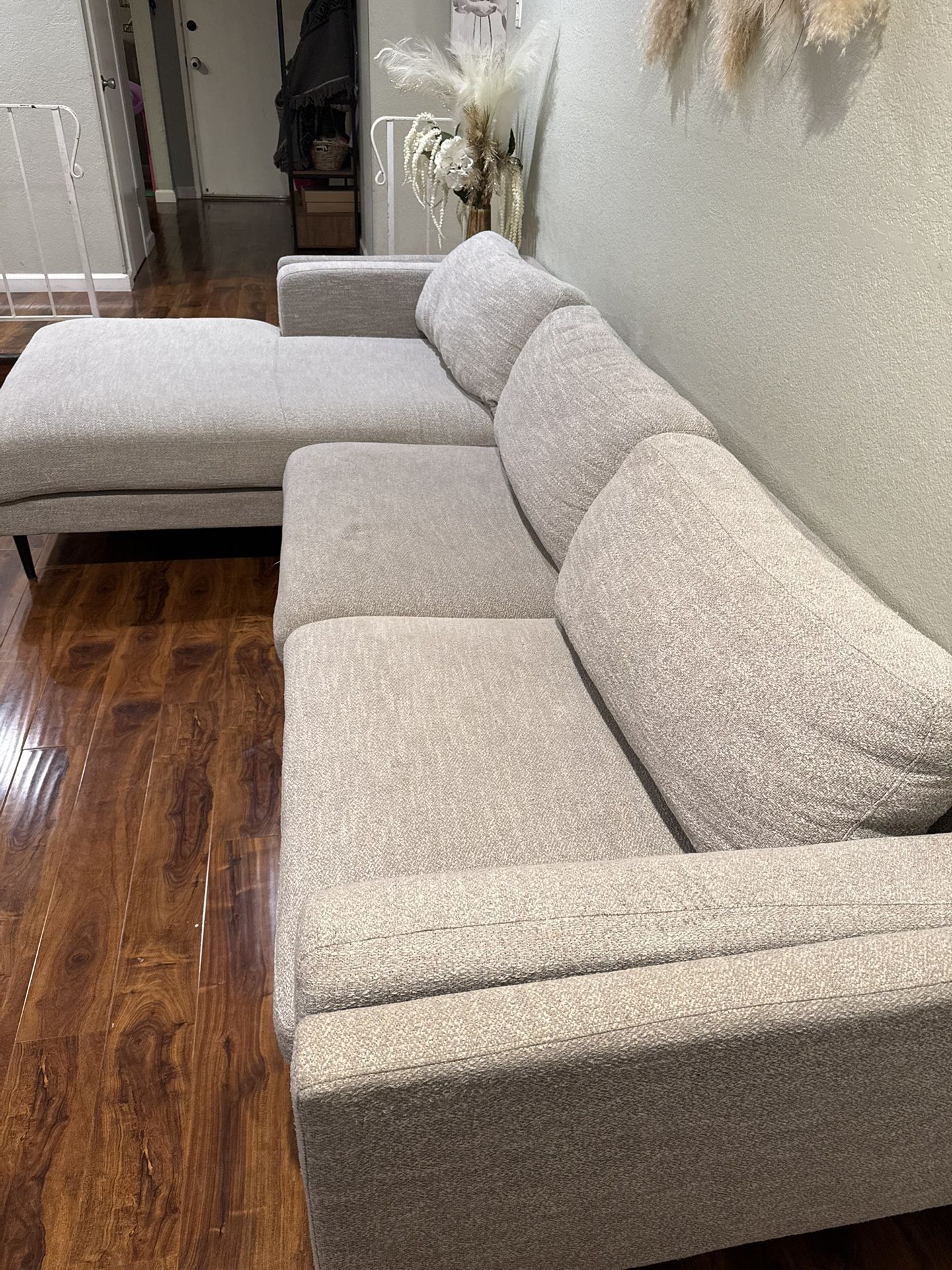 Living spaces sofa. All clean ready to go to a home . Sorry I didn’t take the dimensions before taking it apart .