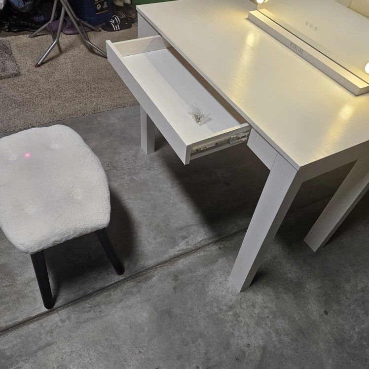 Desk with drawer size 39"W x 20"D x 30"H , Lighted vanity mirror with USB, and small bench in good condition. Take all $99