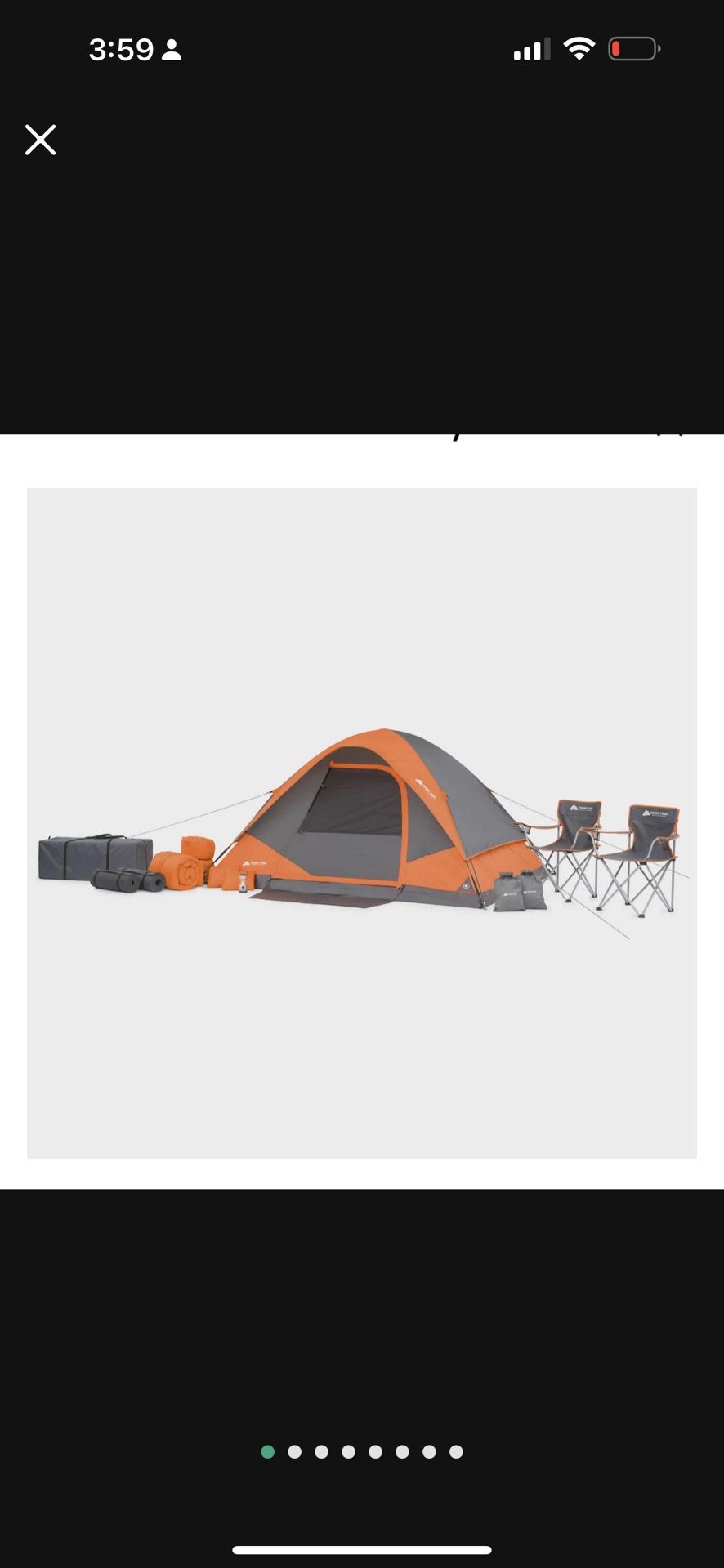 Brand new Ozark Trail 22-Piece Camping Combo: • Includes 4-person camping tent, 1 gear loft, 8 steel tent stakes, 2 sleeping bags, 2 pillows, 2 foam sleeping pads, 2 chairs, 2 dry bags, 1 lantern and 1 carry-all bag • Free-standing design for easy assembly • Mesh walls with removable rainfly provide ample ventilation • Ozark Trail tent includes a rainfly, gear loft, gear pocket, e-port access and welcome mat • Tent sleeps 4 with a 52" center height • Tent dimensions: 9' L x 7' W x 52" H • Lantern features a lifetime LED bulb and a 16-hour run time • Lantern on this Ozark Trail camping combo requires three AA batteries (not included) • Camp chair dimensions: 32" L x 20" W x 32" H • Camp chair weight capacity (per chair): 225 lbs • Stuff sacks feature a roll-top closure to keep gear dry • Sleeping bag dimensions: 74" x 32" • Sleeping bag weight: 2 lbs • Foam mat dimensions: 71" L x 20" W x .4" H • Pillow dimensions: 11" x 9"