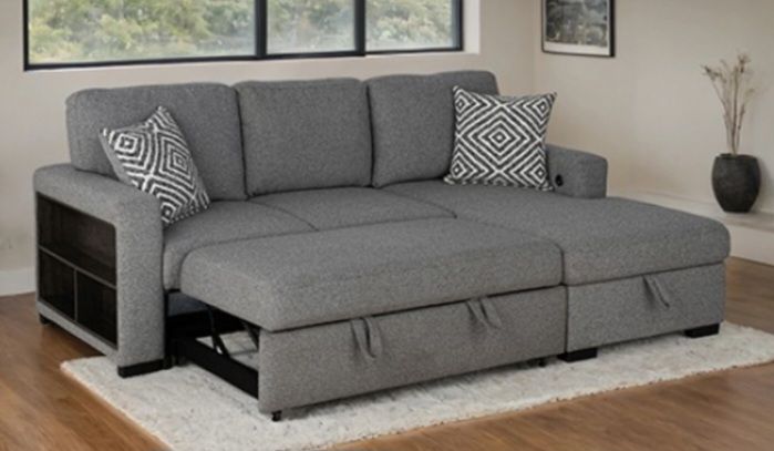 Onlinefurniturebroker.com βπ« We do not have a showroom. We deliver directly from the manufacturer to your home π . π Delivery is only $40 π οΈ Assembly is an extra charge. Price on assembly depends on which item you order! π΅ We accept cash on delivery Mattresses are sold separately π₯We are voted #1 on offer up, please also view other options on our page!!! Beds, bedroom sets, sectional, sofas, daybed, futon, vanity, dining set, chairs, recliner, Loveseat, dresser, queen bed, king bed, desk, kitchen cabinets, shaker cabinet, grey sectional, grey sofa FM64005GY-SECT-R Contemporary GrayFabric, Foam, Engineered Wood Track Arms w/ Bookcase Dropdown Table w/ USB-A & USB-C Charging Ports Chaise w/ Storage Pull-Out Sleeper Pocket Coil w/ Foam 100% Polyester Fabric Pillows Included Sectional. 93"W X 61"D X 38"H(SEAT HT: 18", SEAT DP: 22")