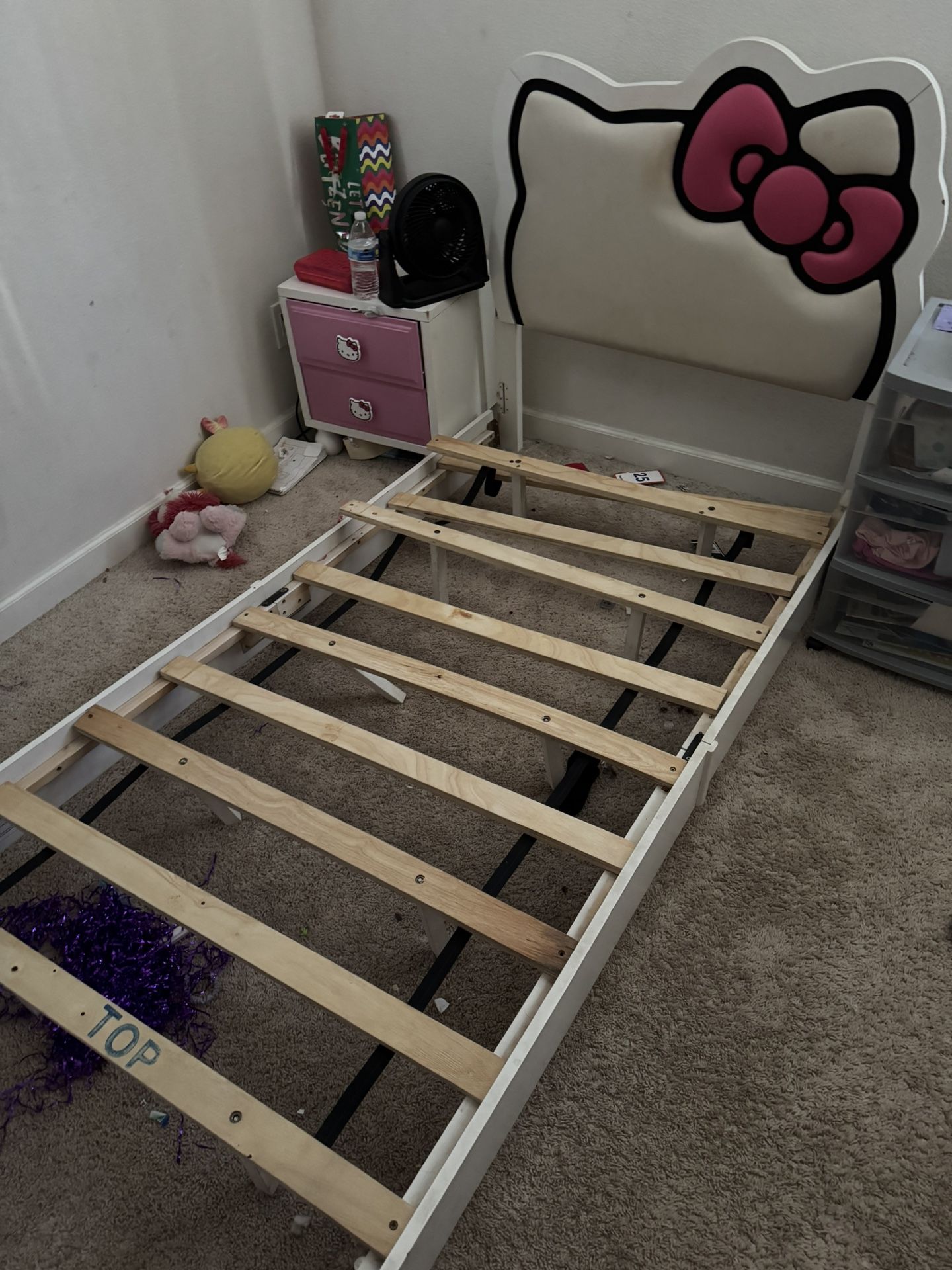 Little kids twin bed frame. In decent shape. Will need to rescrew up to board. Maybe a bigger screw will work. Will hold for a few days then trash. $5