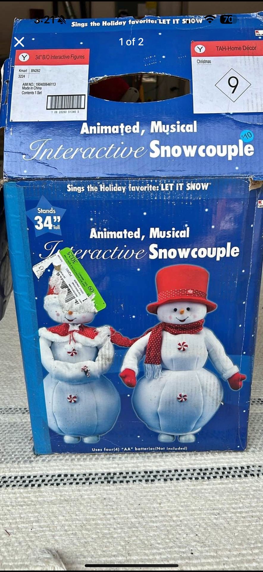 Festive animated snowman and snowwoman set that sings βLet It Snowβ. Perfect for holiday decorating indoors or on a covered porch. πΆ Plays music & moves β Stands 34β tall π Uses 4 AA batteries (not included) π¦ Comes with original box Condition: Pre-owned, tested working. Box shows wear but figures are in good shape. π Pickup in Bull Mountain π΅ Cash or Venmo only