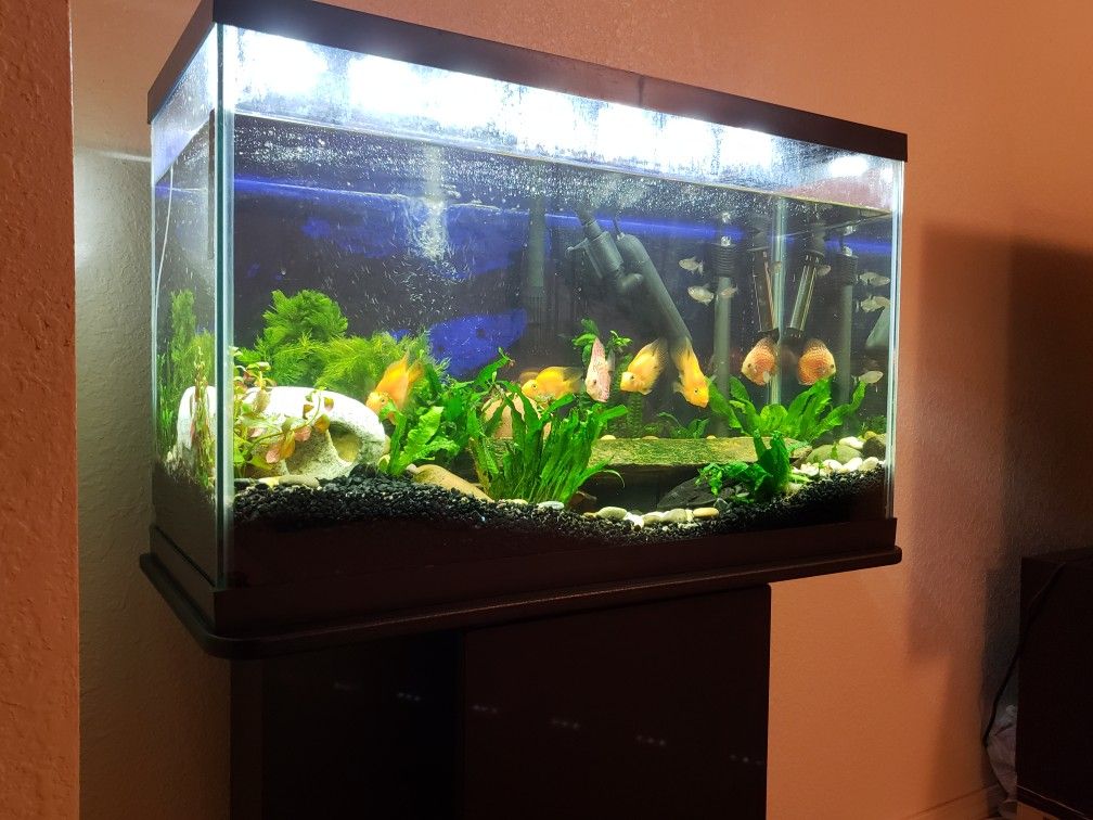 29 Gallon fish tank, hood, with stand and decoration stones and black chips/gravel. Can help assemble and do aquascape for additional payment. Fish and live plants already sold and is not part of this sale.