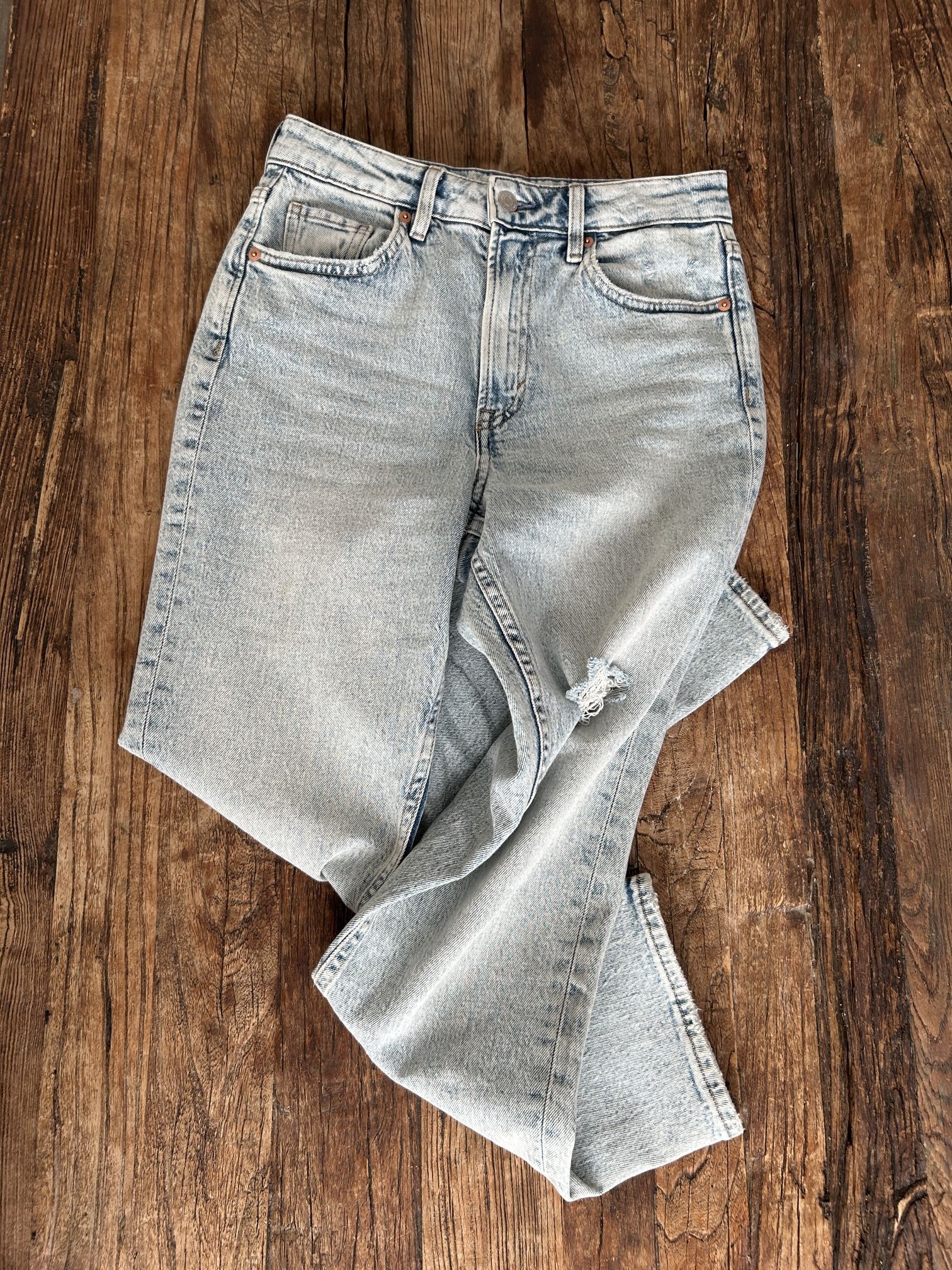 H&M &DENIM slim straight jeans in a light wash denim. Designed with a high waist and regular fit, featuring a straight-leg silhouette with an ankle-length inseam. Easy everyday jeans that work for casual or dressed-up looks. Details: • Brand: H&M &DENIM • Style: Slim Straight • Fit: Regular fit • Rise: High waist • Leg: Straight • Inseam: 27 inches • Color: Light blue / washed denim • Size: • EUR 36 • US 4 • CA 4 • MX 4 • CN 165/68A • Made in Bangladesh Condition: Gently used, ( used just 2 times) in good condition. No stains or holes observed. Please refer to photos for details.