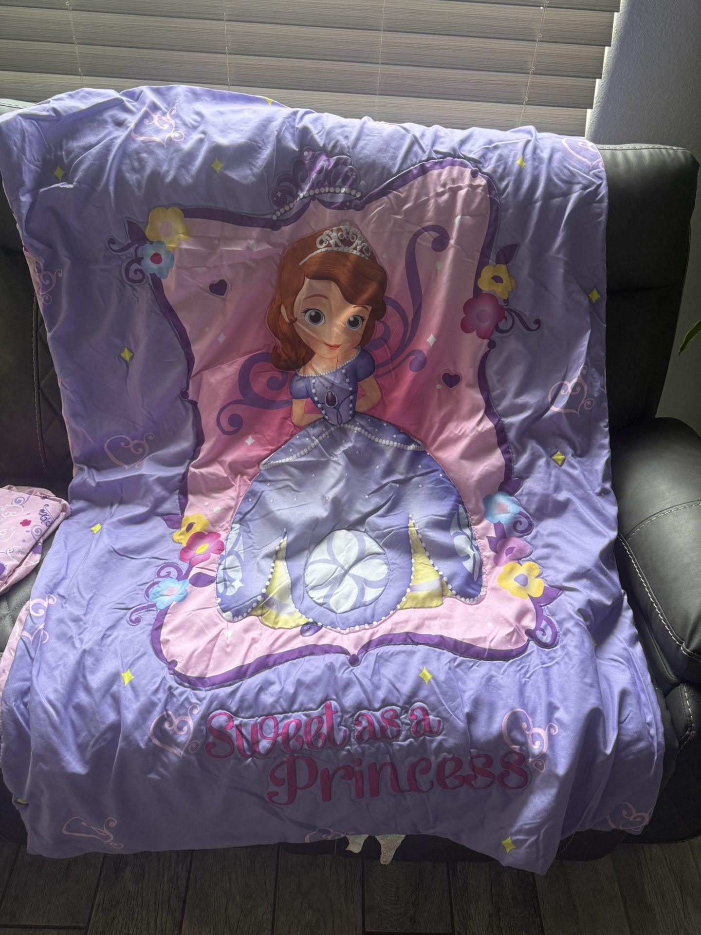 Have a toddler bedding set of Sofia the first colors purple and pink. It’s 4 piece bedding, fitted sheet, top sheet, pillow case and comforter.