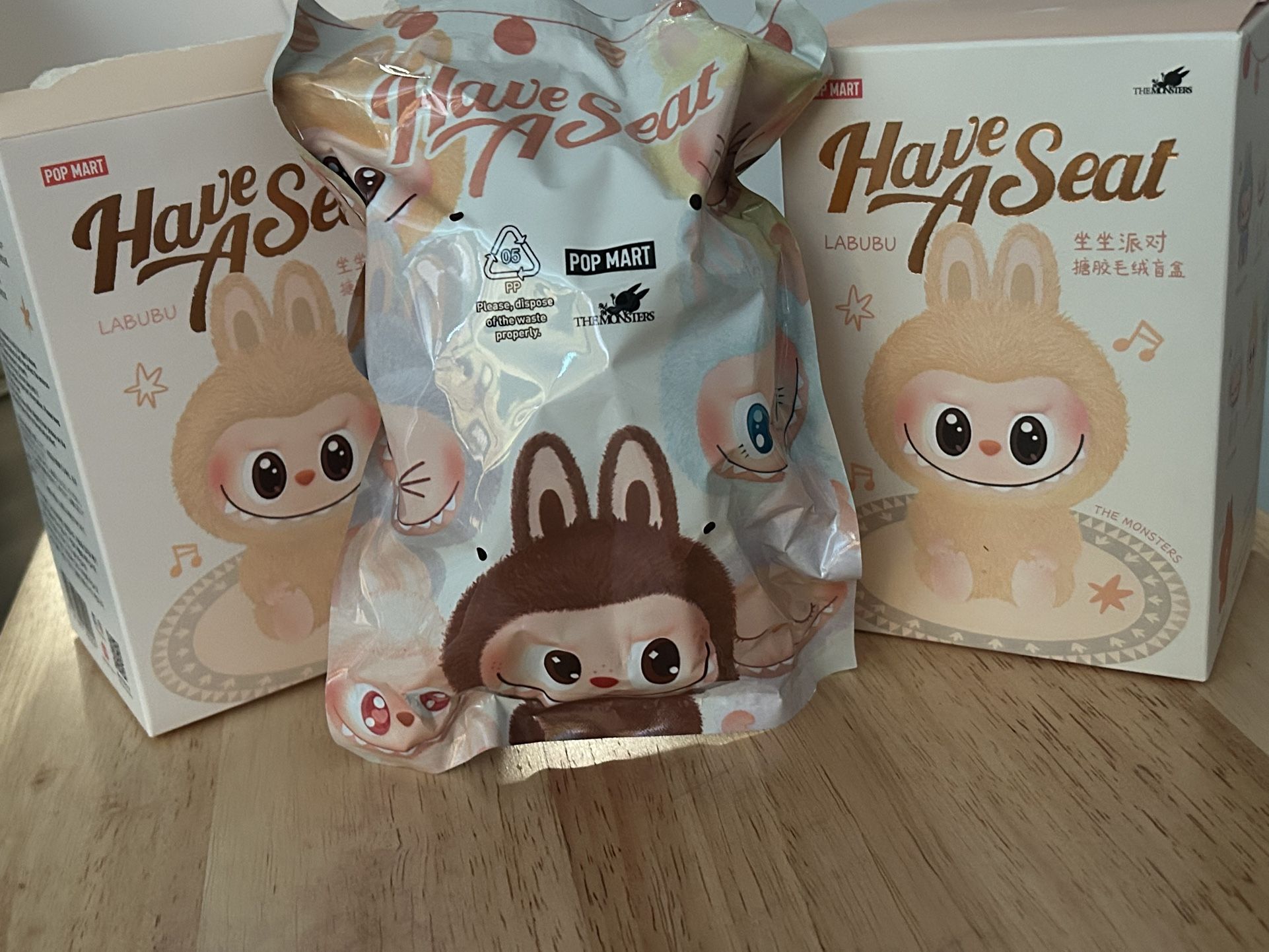 Three mystery labubu for sale, one box opened but toy still sealed, the other two are still factory sealed.