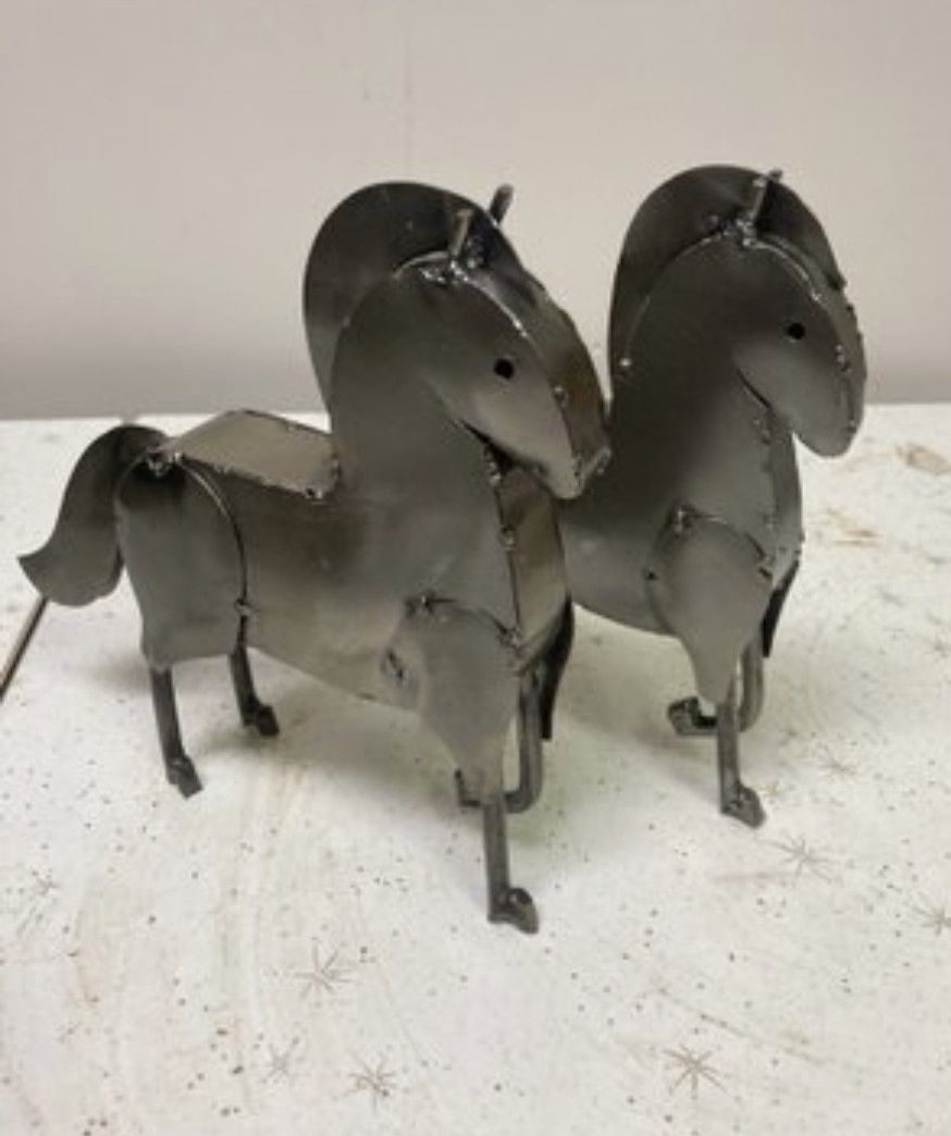 Vintage Mid Century Modern style set of two handmade gray metal horse sculptures, characteristic of Mexican modernism and brutalist folk art in the style of Manuel Felguérez Barra. Horses are made of welded metal and made in mexico. Would look great displayed on a shelf or bookcase as home decor. Measures approximately 1.5 inches by 7.5 inches by 7.5 inches tall. Can deliver in the New Haven area for an additional $5