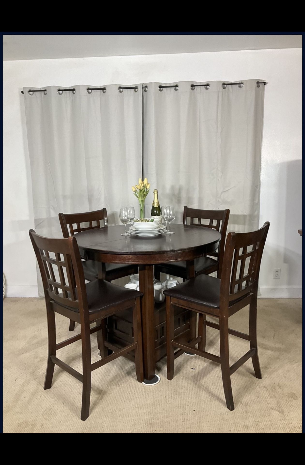 PICK UP ONLY Made for today’s modern lifestyle, this set offers functionality, versatility and style. Set an intimate (3.5’ round) table for daily meals, or extend it (5’ oval) for more formal dinners. Not just for dining, the pub table doubles as a sideboard with convenient display & storage base for keeping essentials at hand or creating a bar. Dine on 4 high chairs with window pane backs and comfortable cushioned seats. Solid, sturdy construction. Great condition with minor ware. Hablo español.