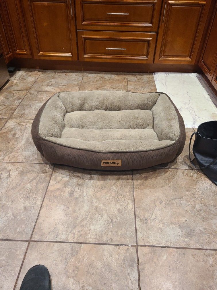 VibrantLife pet bed dimentions 26x38 tan/nude plush lining w/chocolate brown outer lining stuffed w/imitation down. Feels super comfy. Took tags off but our dog has literally never used it before, he has a thick coat so he prefers the cool tile or hardwood over anything. He won't even lay on a sheet or blanket for more then 2min