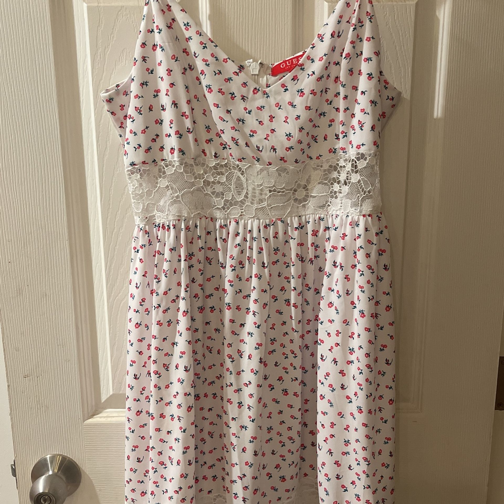 Really cute! Long dress. White with red flowers. Lace around waist and legs. Size L Zipper back