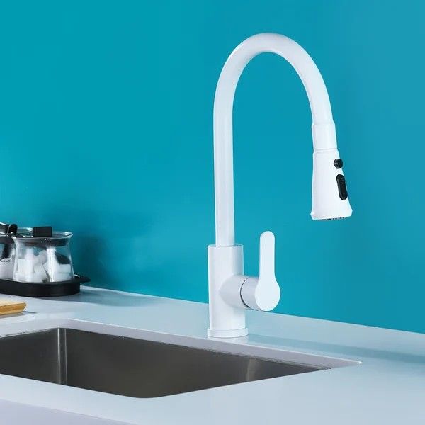 Feel the joy of cooking with this stunning white kitchen faucet. The high-arc spout gives you plenty of room to fill large pots and pans, and the pull-down sprayer is perfect for rinsing dishes or cleaning up messes. The dual-function sprayer lets you choose between a powerful jet stream or a gentle mist, so you can always get the job done right. This faucet is made from high-quality materials that are built to last. The chrome finish is scratch-resistant and easy to clean, and the single-handle operation makes it easy to control the water flow. But more than just being functional, this faucet is also a work of art. The sleek, modern design will complement any kitchen décor, and the white finish will brighten up any space.