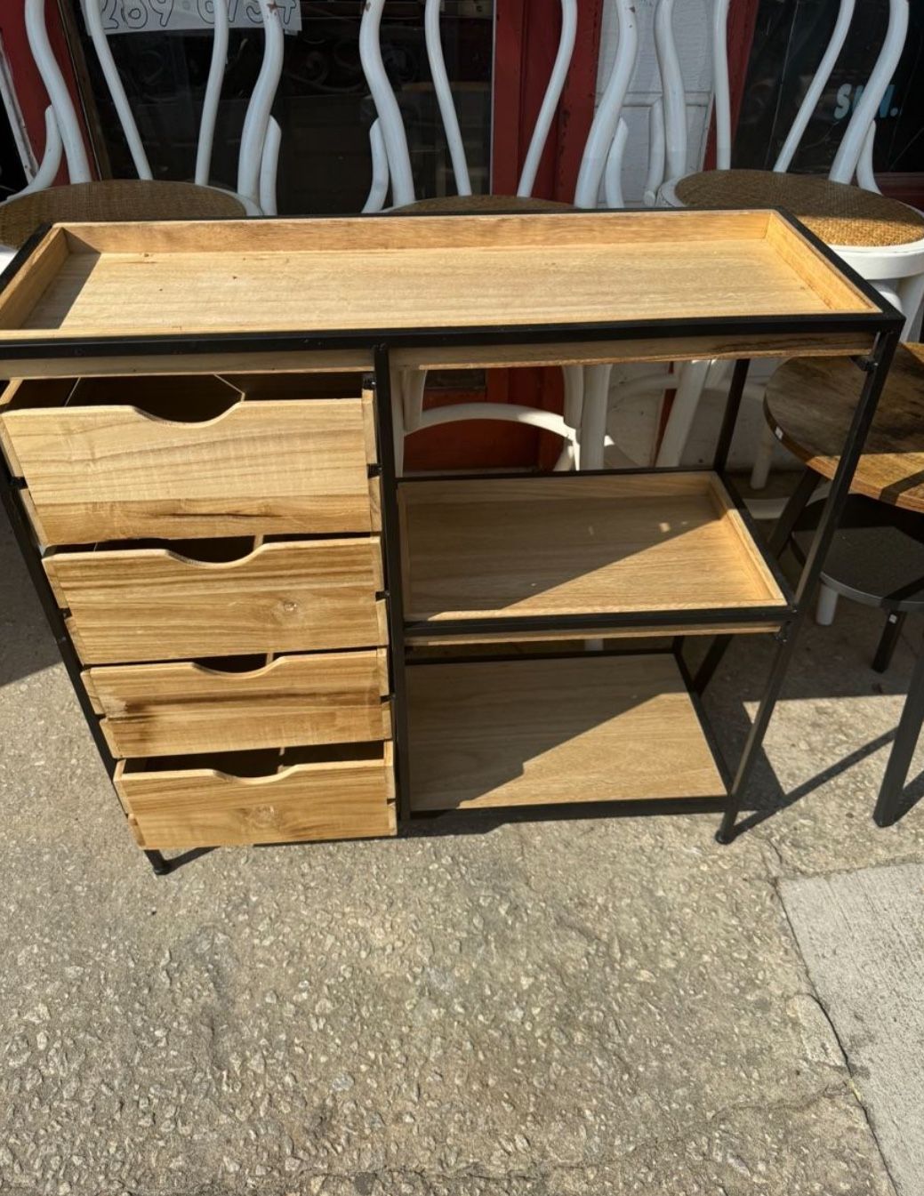 Four Drawer Storage Cabinet by Three Hands. Constructed of metal and wood veneers. Includes four storage drawers. Metal finished in a black color. Perfect use for any room as accent or storage piece