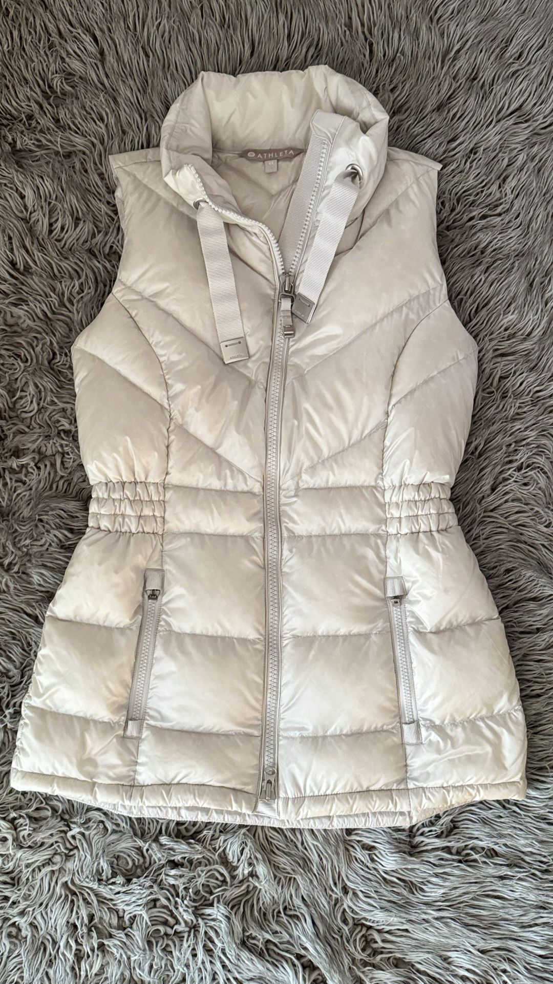 ATHLETA women’s vest color light silver,size XS, Looks like new, elastic waist, goose down 90% puffer, full zip, zippered exterior pocket with hidden phone sleeve, slim fit , hip length.