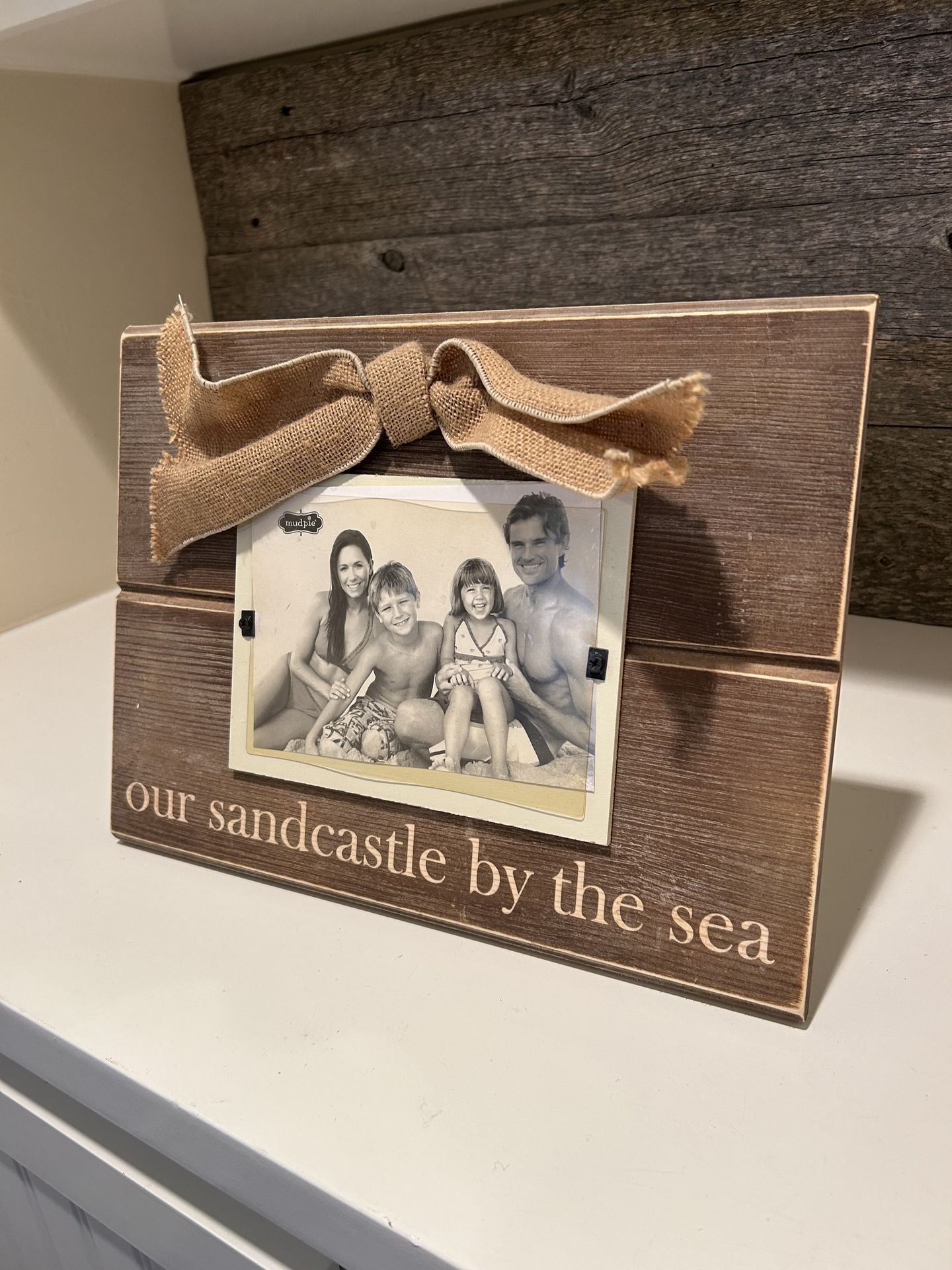 Wood coastal style photo frame with burlap bow detail and the phrase “our sandcastle by the sea” engraved across the bottom. Perfect for beach homes, coastal decor, or family vacation photos. Warm wood tone with a rustic, farmhouse coastal look. Features Tabletop stand and wall hanging hardware Holds one standard photo (approx 4x6 opening) Condition Good pre owned condition with light signs of normal use. Minor wear consistent with display. No cracks or structural damage. Great for beach house decor, nursery, or family memories.