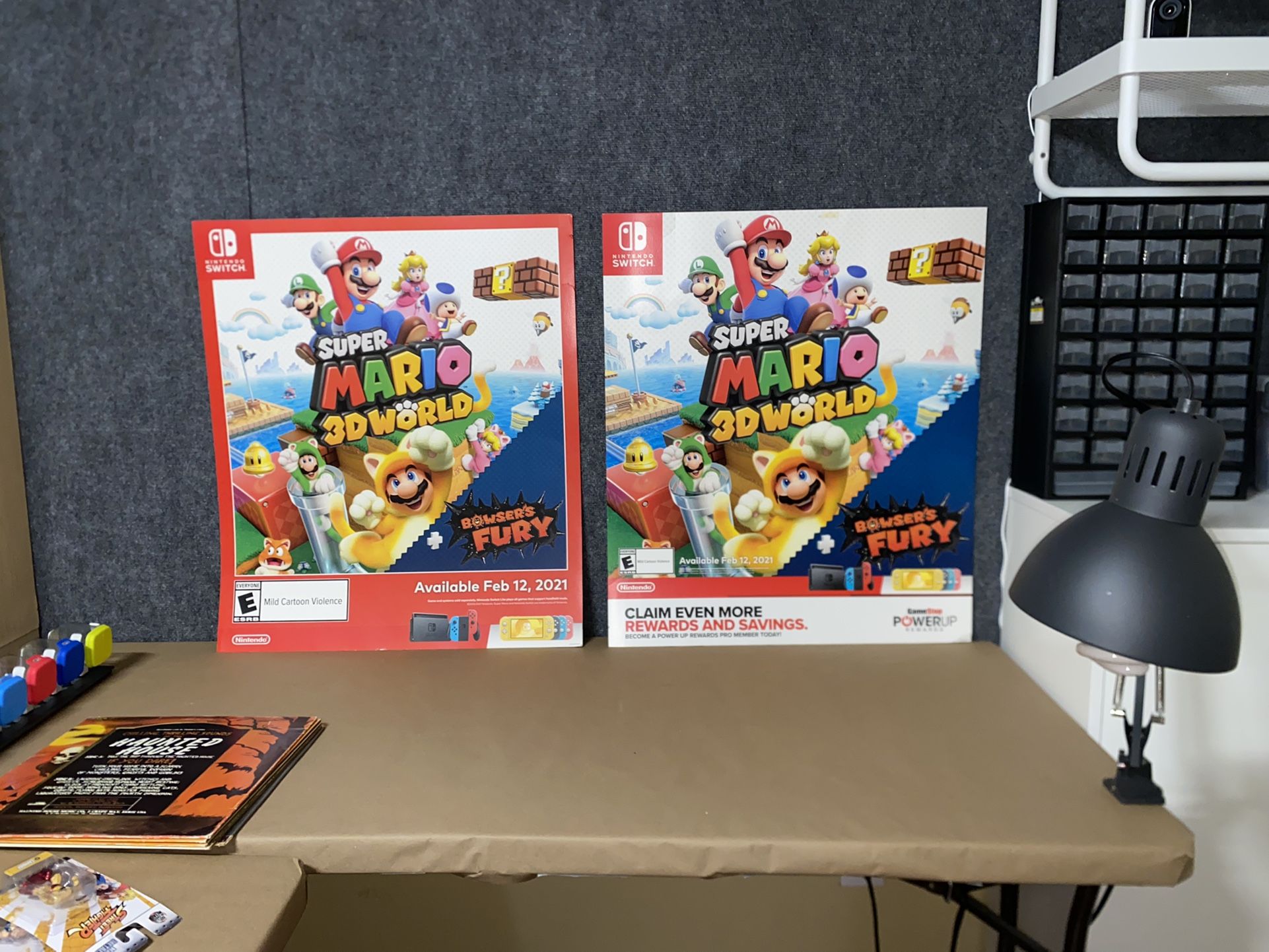 Two Rare GameStop promotional posters for The Nintendo Switch Release of Super Mario 3D world and Bowsers Fury. This is the original Set released in Red and white. Board grade is tick and sturdy, there are a few blemishes and a couple of minor nicks on edges. Great addition to any game room or for Nintendo collectors. Asking 60 cash for both OBO. I’m located in Blue diamond
