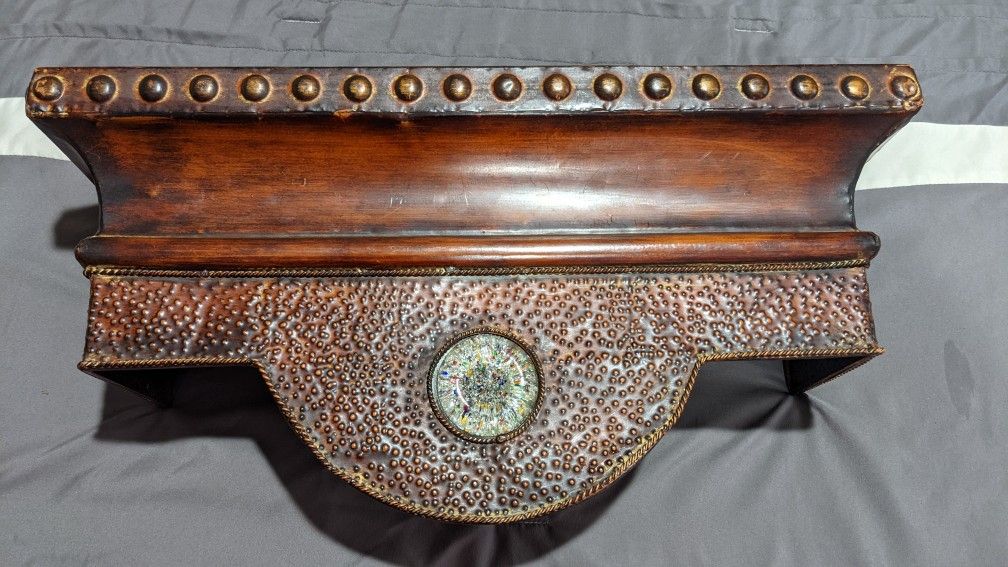 W 21 1/2" × H 10 1/2"× D 7" Metal with faux wood finish Decorative glass with multi color inlay Like new Pick up in West 7th neighborhood.