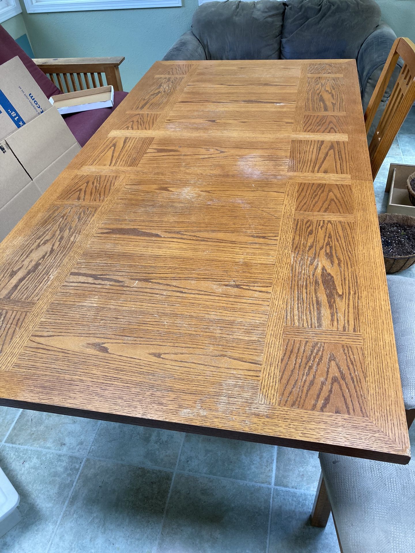 Oak veneer table with leaf and five chairs. 7’ x 3.5’ with leaf in. It’s in used condition, but could be a cool project or throw a table cloth on top. Heavy. Chairs could use some love. $100 obo