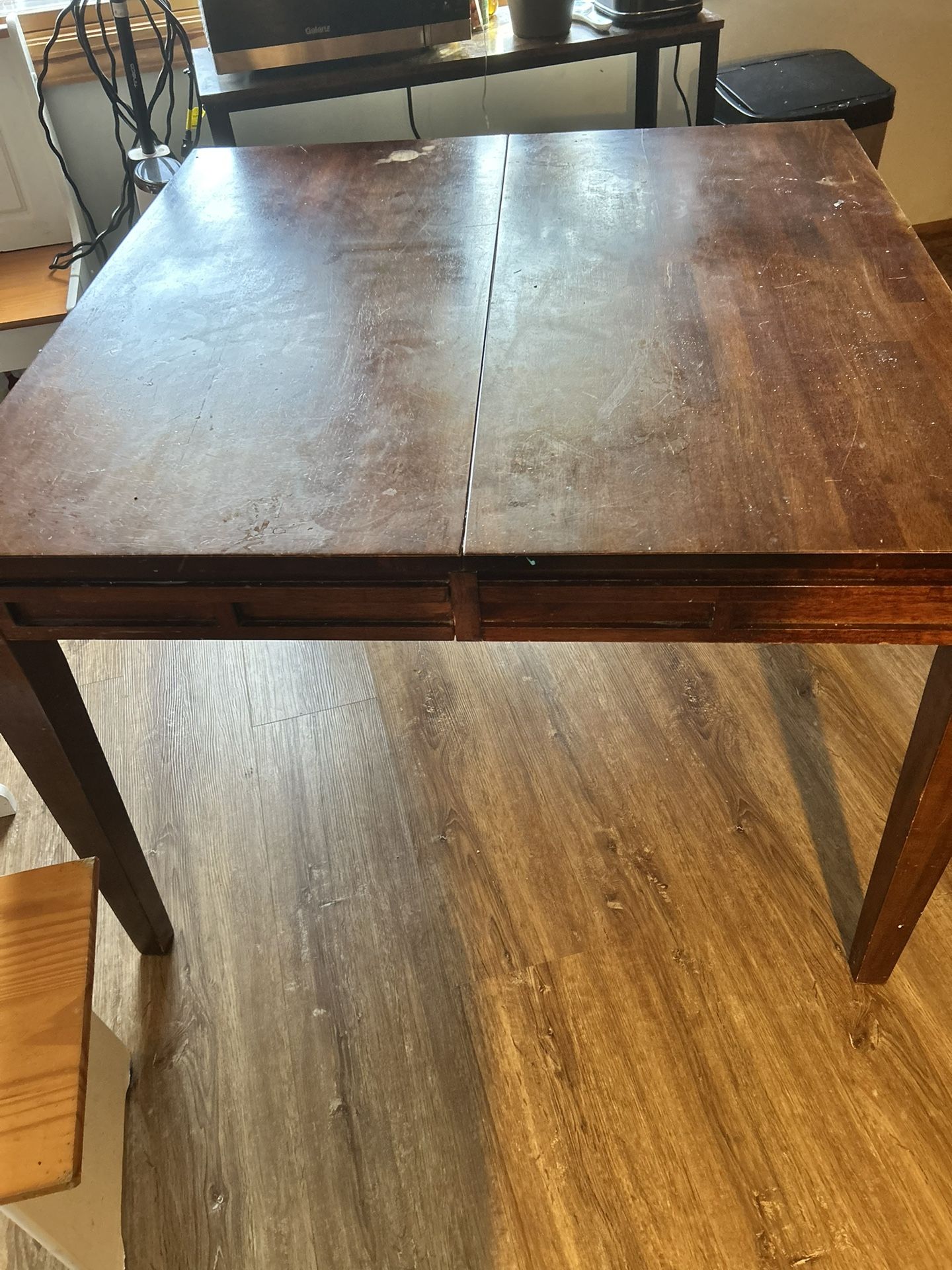 Brown wooden table. 44x44 Leaf available makes it 44x64