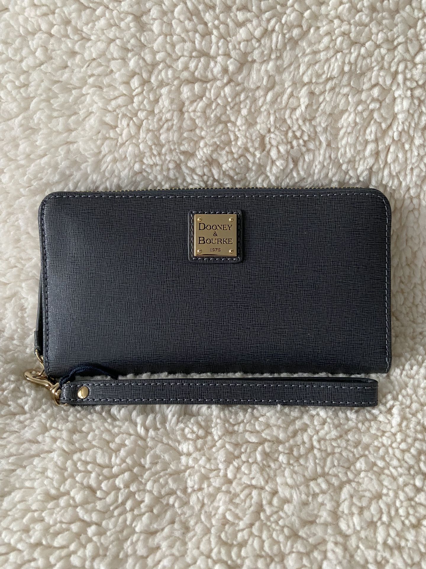 Gorgeous in dark gray w/ white & blue striped interior. Two compartments. One zip compartment. Twelve credit card slots. Italian Saffiano leather Zipper closure Detachable wrist strap. Strap length: 7” 4.5"H x 1"W x 8.25"L 11 oz