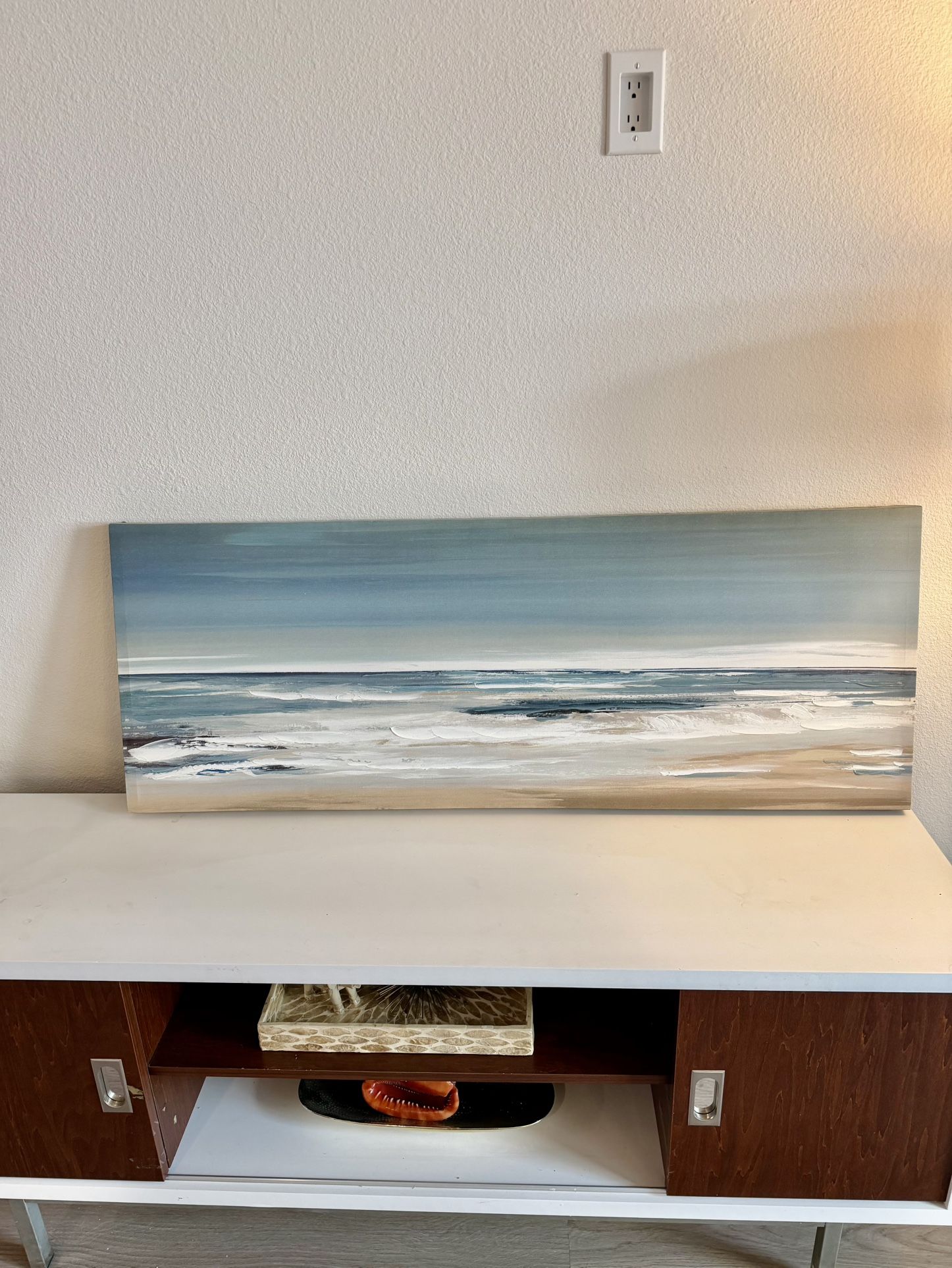 Beautiful horizontal canvas wall art featuring a serene coastal seascape. The artwork depicts soft ocean waves rolling onto a sandy shoreline, with layered tones of blue, teal, white, and warm beige. Subtle texture and brushstroke detail give it a calm, modern, beach-inspired feel. • Style: Modern / Coastal / Contemporary • Orientation: Wide horizontal (panoramic) • Colors: Blue, teal, white, sand, soft gray • Material: Canvas (ready to hang or lean) • Condition: Excellent, clean, no visible damage Perfect for a living room, bedroom, office, beach house, or staged rental. Neutral and calming piece that works well with modern, coastal, or minimalist decor.