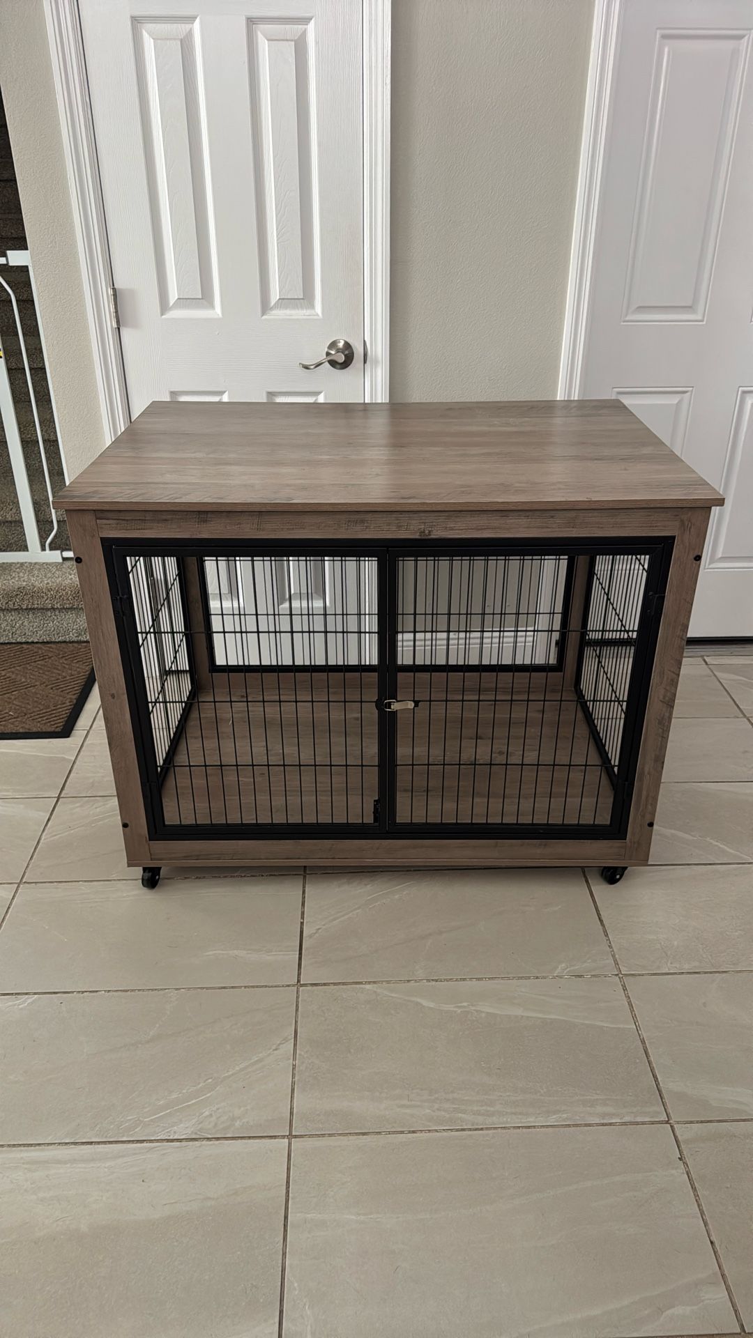 Large dog/pet cage with wheels attached to the bottom of the cage. Height 34" Length 44" Width 30"