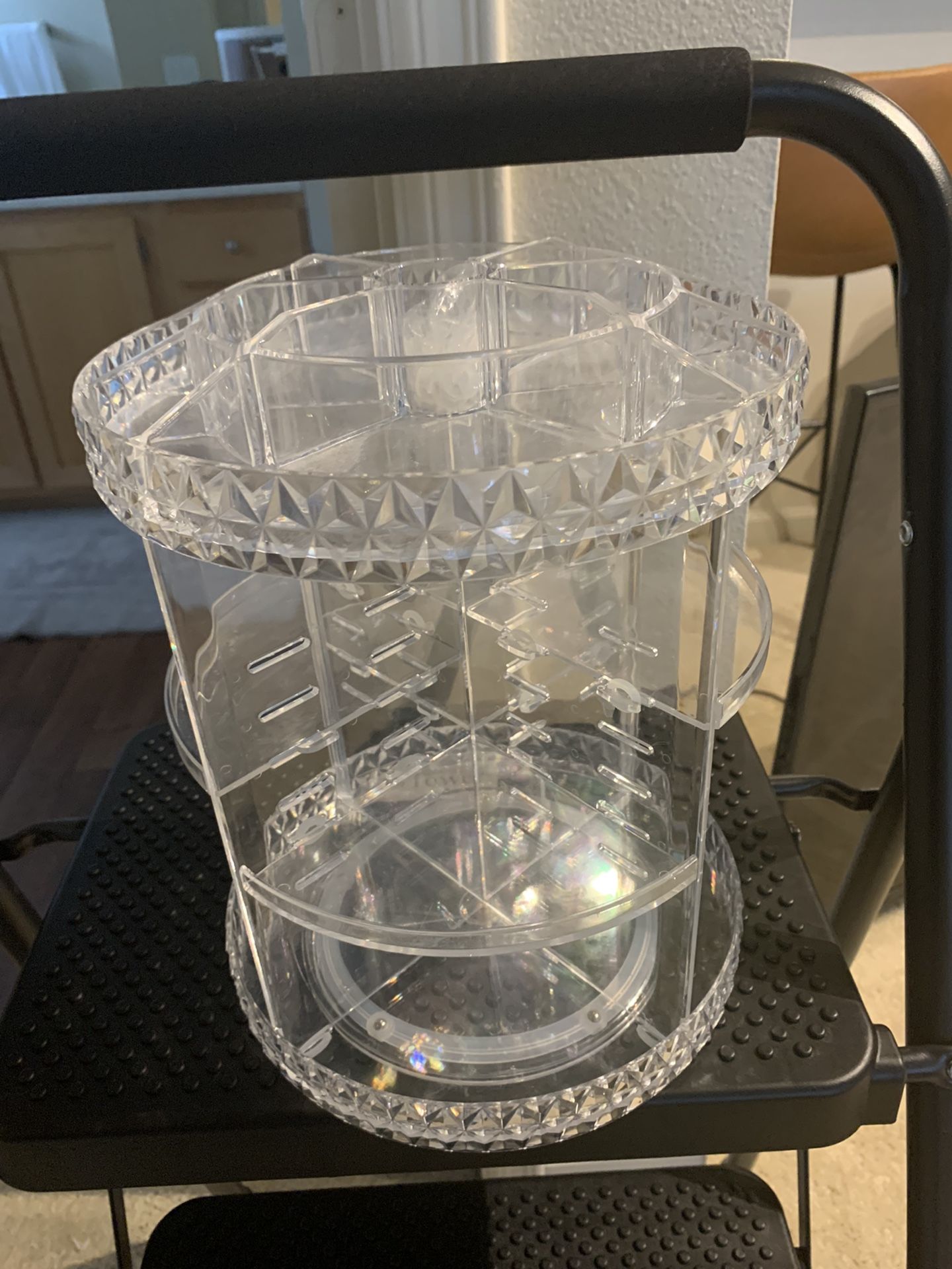 Like new, still have plastic spacer things in a bag and only used for 6 months. Features acrylic construction to store your makeup and jewelry with an effortless view. Turn your loose makeup into your very own beauty counter or use this case as a jewelry box to complete your look from head to toe! This storage case can be stored in bathrooms, closets, vanity counters, dressers, and most tabletop. Measures approximately 8.75" Lx 10.75" H • 360 Degree makeup organizer (clear) - organize all your cosmetics, toiletries and more with a 4-tier rotating tabletop carousel - great for any girl, teen, adult, fashion and beauty lover • Large storage capacity - beautifully display lipsticks, foundations, bronzers, blushes, eye shadows, primers, powders, makeup brushes and manicure tools - toiletries like deodorant, facial scrubs, lotions, cleansing towels, hair products • Reduces clutter - save time getting ready and maximize space - quickly refine by size, brand, color etc - great storage rack for bedroom, bathroom closet, kitchen, vanity tabletop, countertop, or desk organization • Rotates for easy access - items are always within easy reach, simply spin the organizer to stow or retrieve products on multi-level tier trays, steady base ensure cosmetics stay in place during rotation • Adjustable tray design - trays adjust to height of your products, easy assembly, features 4-tiers, 8 shelf trays and 15 divided slot compartments on top tier • Versatile