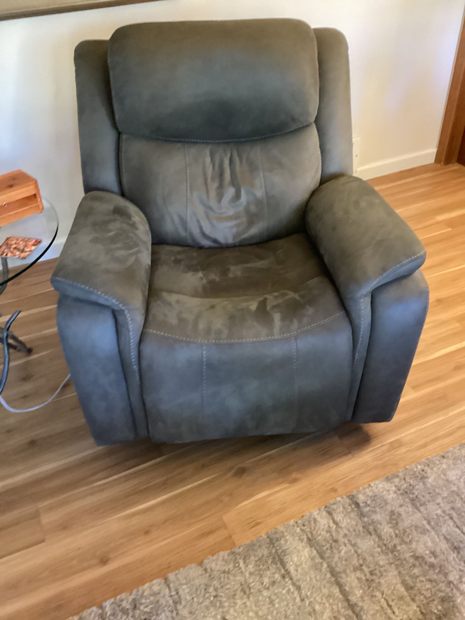 Dark grey powered rocker-recliner w power adjustable headrest. USB CHARGER .microfiber. 5 years old and in great condition. Well cared for.