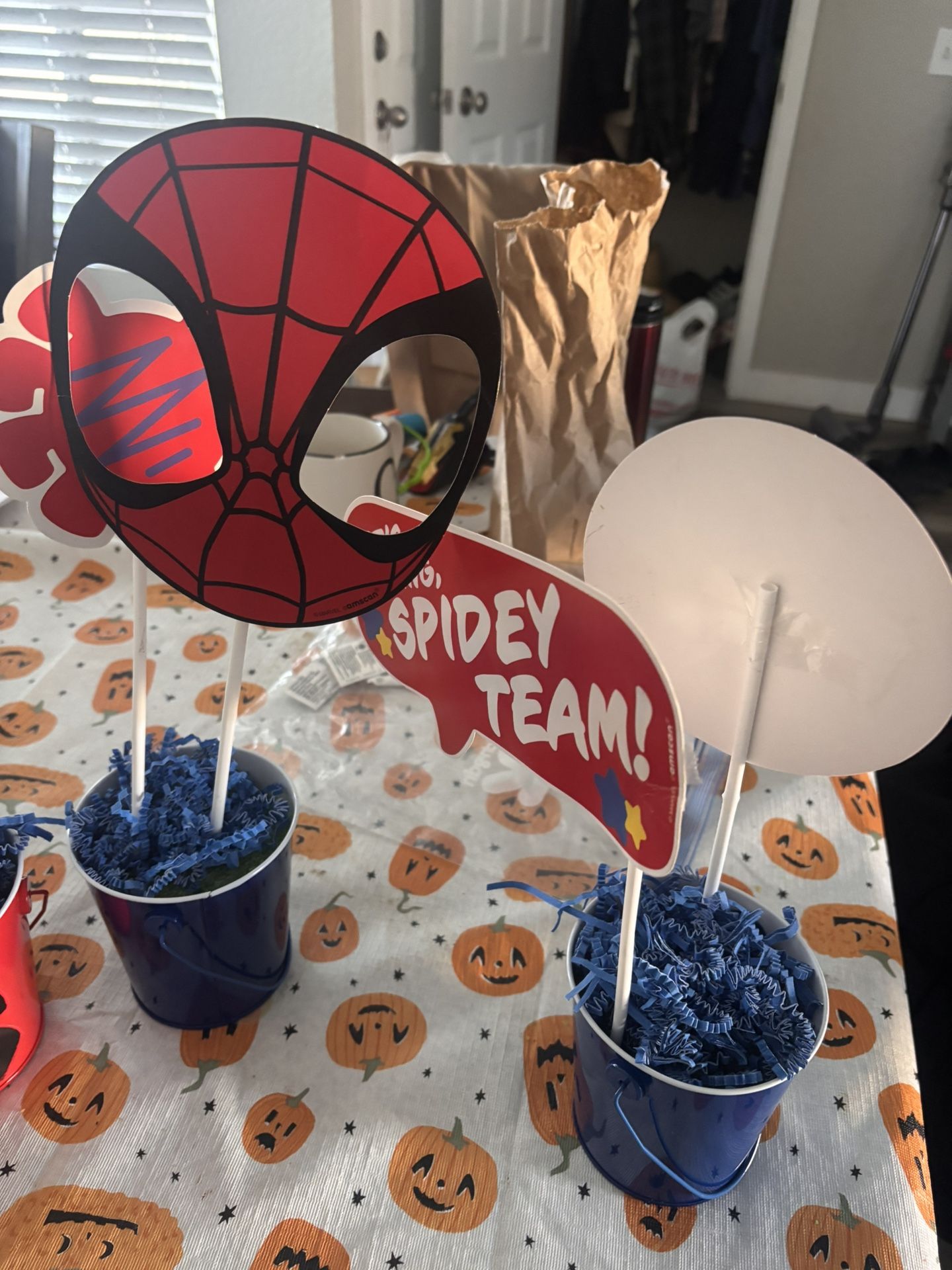 3 spider man banners 1 happy birthday poster 1 full size spidey and friends back drop 3 center pieces with extra bag of blue confetti paper. Pick up perris or Menifee