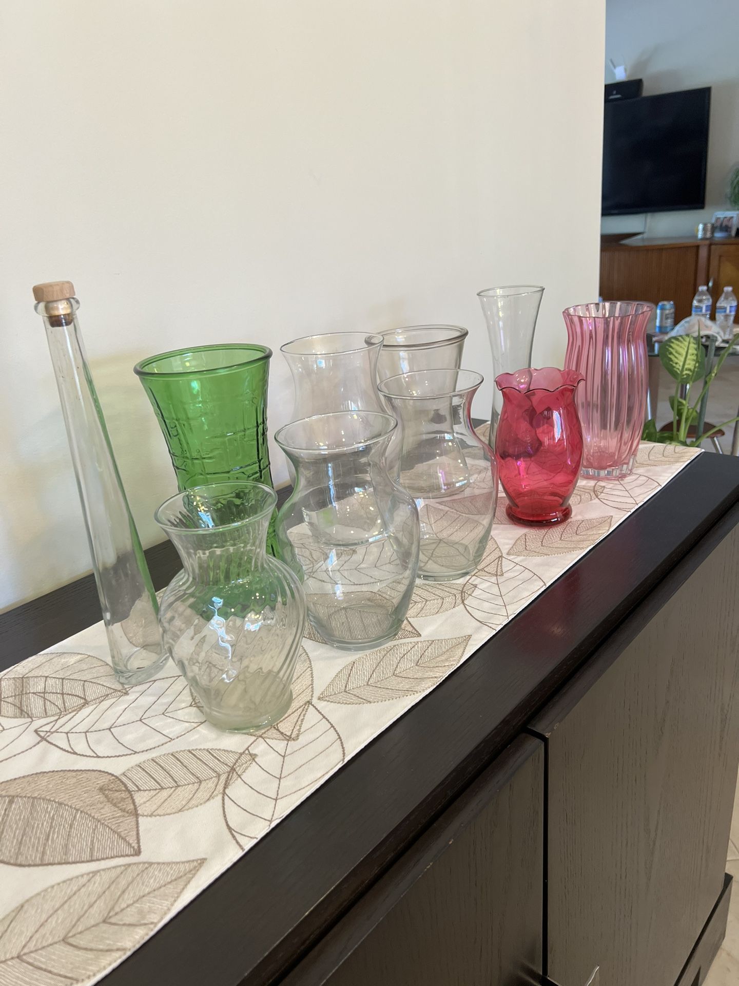 Asking prices or best offer!! Pink vases $3 each or 2/$5 Green vase $3.00 2 clear same pattern 2/5.00 Large same pattern as above $3 Clear swirl $2.00 Thin is $1.50 Grey $2 Plain large $1 Located near I75 and Griffin Road!! Take all for$20 located near I 75 and Griffin Road