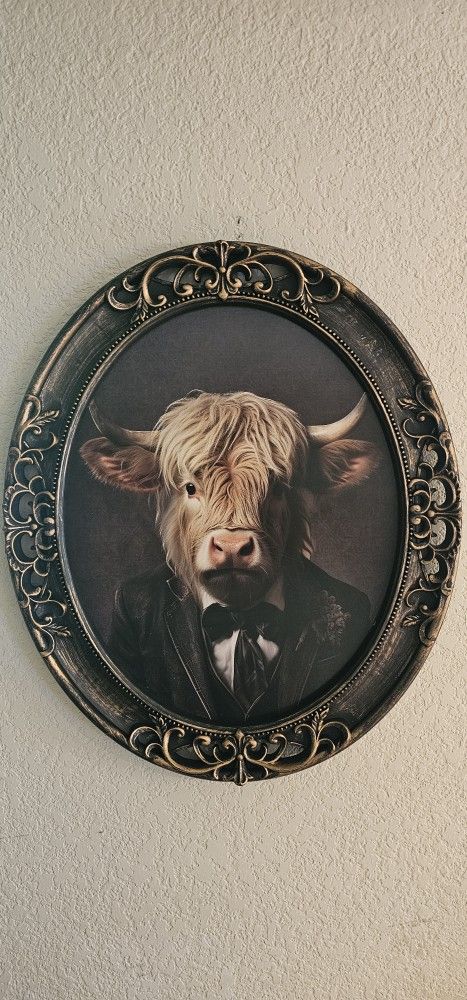 Elegant Cow Wall Decor. New Dimensions: 24.25" H x 20.25" W x 1.5" D Material: Plastic & MDF Shape: Oval Color: Black, Gold, Tan & Pink Orientation: Vertical Includes: 2 D-Rings Pickup in South Grand Prairie by Joe Pool Lake. Cash only, please.