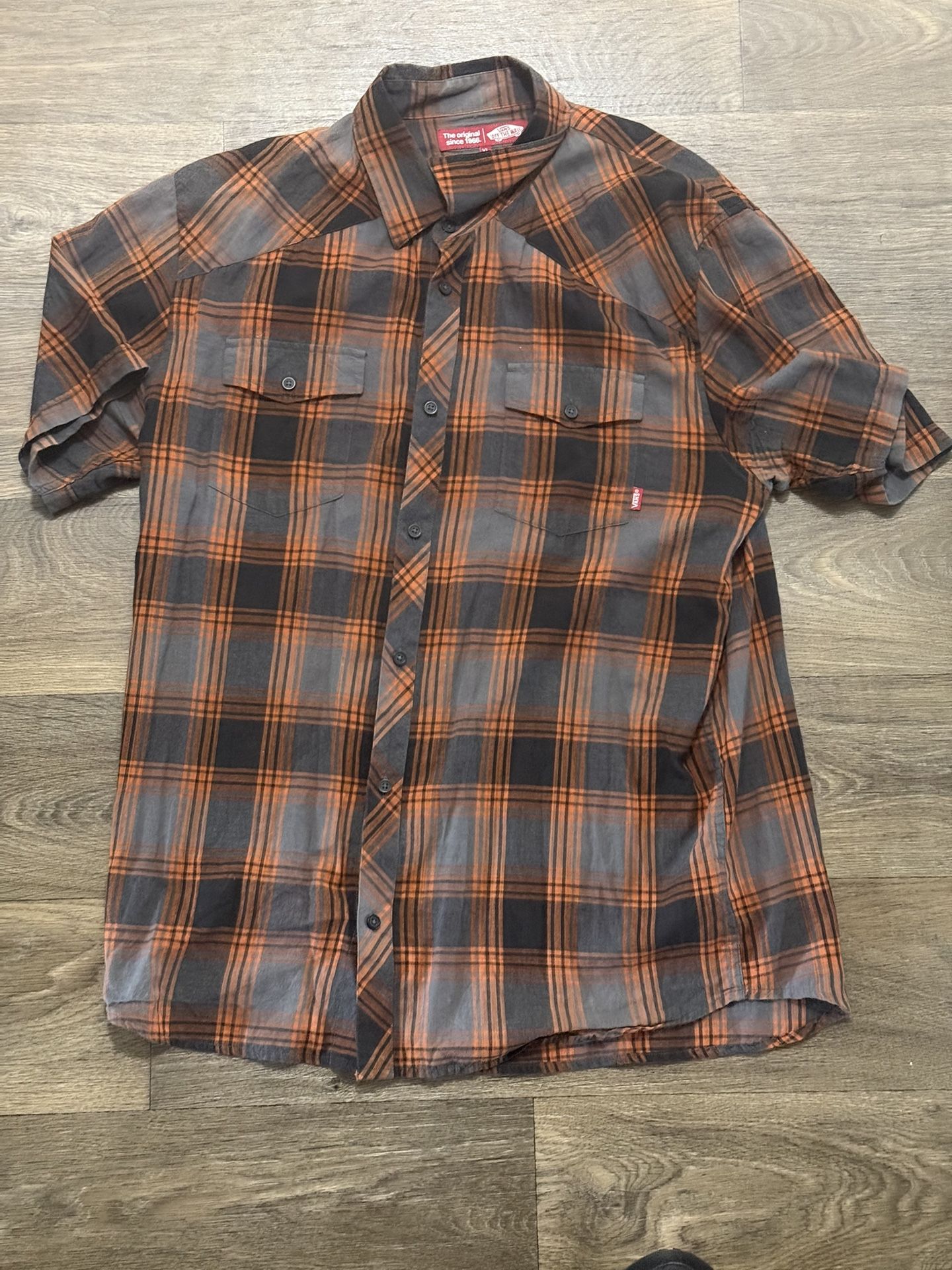 Men’s size XL flannel print button up, in orange/gray/black color scheme. Perfect condition. No stains or tears. All buttons in place. Smoke free home. Other vans items for sale on my page.