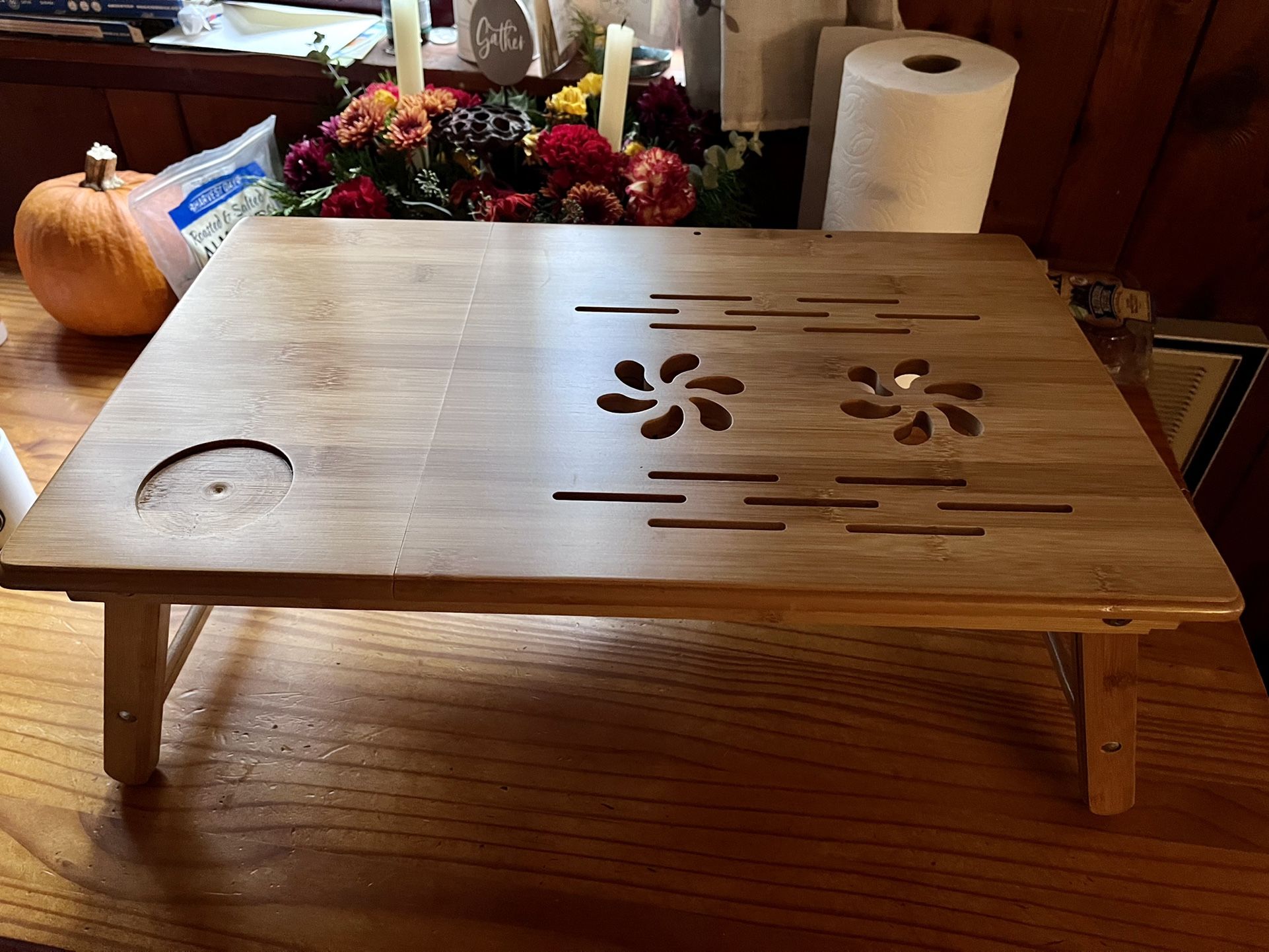 Hardwood lap table meant for doing laptop work on bed or couch. Has vents so laptop does not overheat, height is adjustable, and in overall great condition
