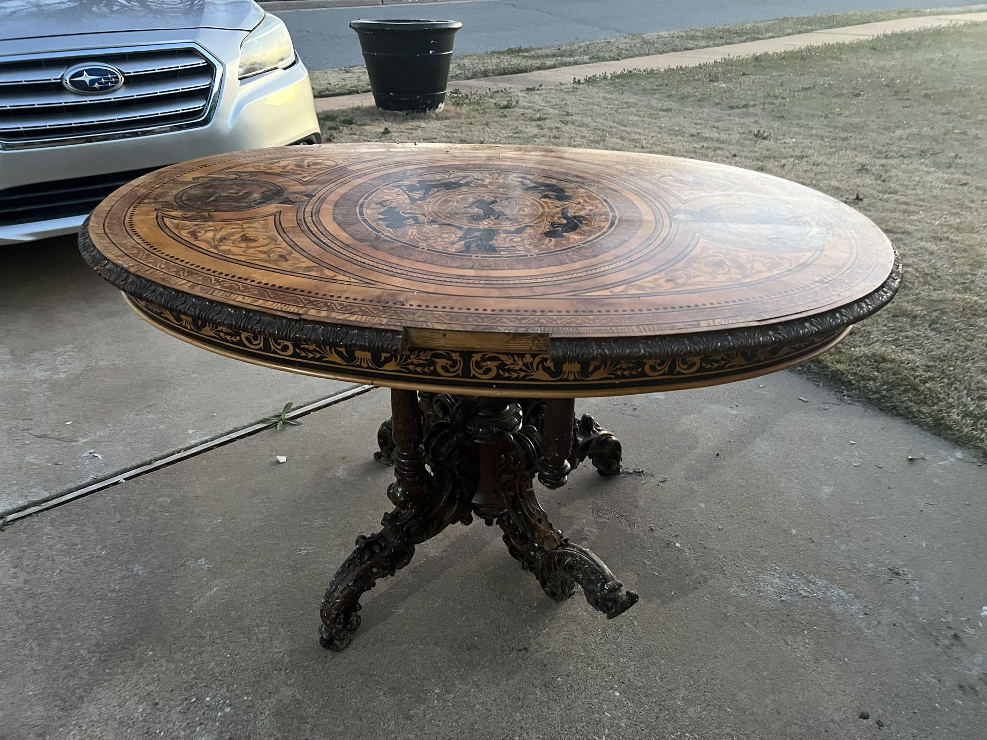 Table from late 18th- early 19th century. I believe it is French or Italian but am not sure. It is inlaid with several scenes and the imps with musical instruments in the center. The stand is removed for renovation and to repair it. I don’t have time to do it. This is an exceptional piece and it needs proper repair to bring it up to value. There are no marks or signature to indicate who built this but similar pieces are priced in the thousands.