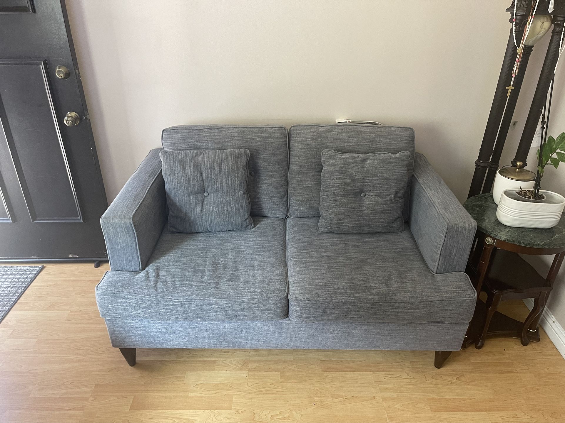 Blue love seat couch for sale. In good and clean shape. Well taken care of. 2 matching throw pillows included. Love seat dimensions: 58”L x 31” H x 36” D.