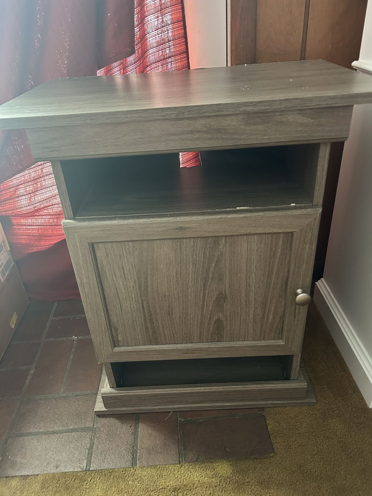 Sturdy stand with cabinet shelves inside into storage areas a little wear and tear color is grayish. Pick up only irondequoit.