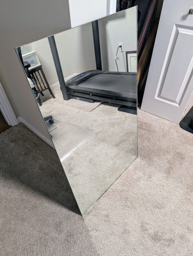 The overall reflection is nice and crisp. There is some minor edge wear on the bottom likely from where it sat in the original mounting hardware. Great for home gym, workout space, dance/yoga studio, garage gym, bathroom. I will include new mirror clips.
