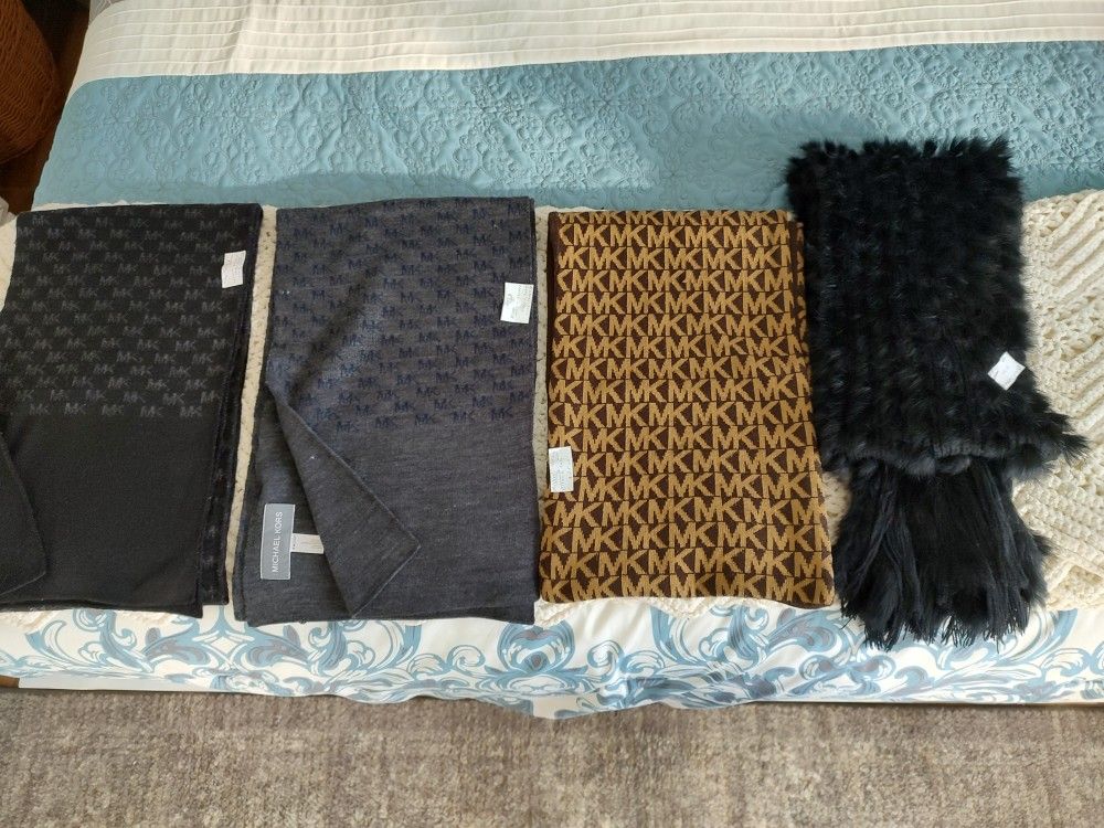 Authentic Michael Kors Scarves. First two were never worn. Michael Kors black with gray MK repeat logo and gray with navy MK repeat logo. 100% acrylic. $30.00 each. Third one is brown with tan repeat MK logo. Lightly used. $25.00. 100% acrylic. Last one is a black cashmere scarf. Only worn a couple of times $25.00. All are authentic and either new or in excellent condition. In Holiday.