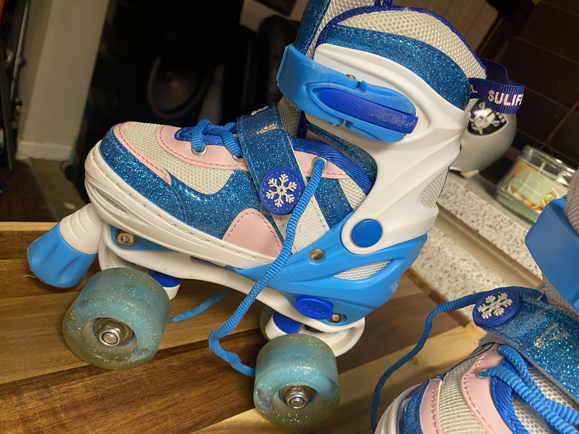 Sulifeel rainbow unicorn light up rollerskates closure type buckle 4 and 5 size adjustable size small they light up colors when the wheels roll. Very nice like new.