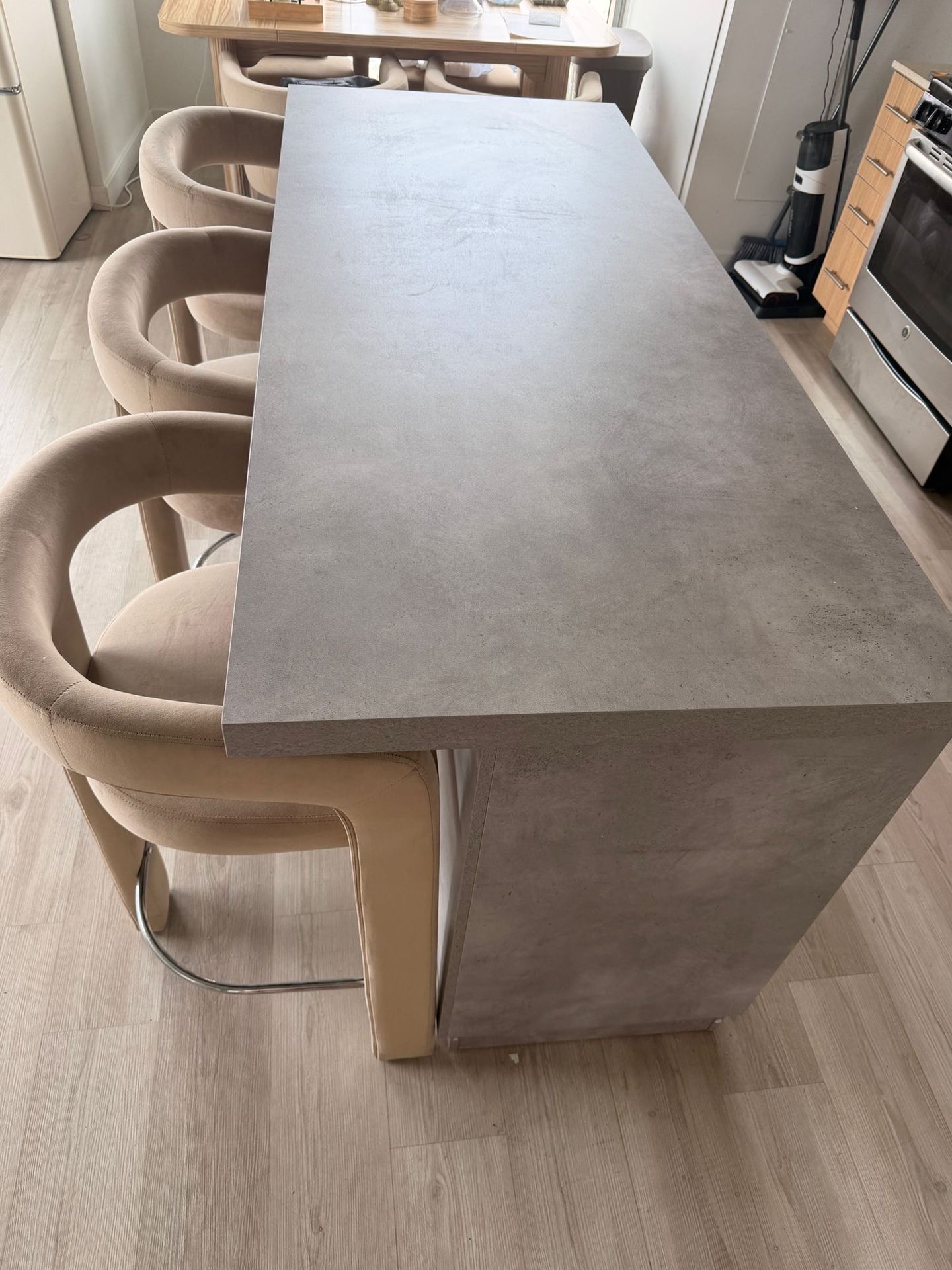 Beautiful 72” modern kitchen island with 3 matching designer bar stools. Purchased only 1 month ago and barely used – in excellent, like-new condition. Kitchen Island: • Size: 72” W x 29.9” D x 35.4” H • Brown/Gray finish • Cabinets, drawer & wine rack • Original price: $1,349 Bar Stools (Set of 3): • PU Grey upholstery • Seat height: 26.25” • 300 lb weight capacity each • Original price: $597 Selling everything together for $975 – firm. Serious buyers only.