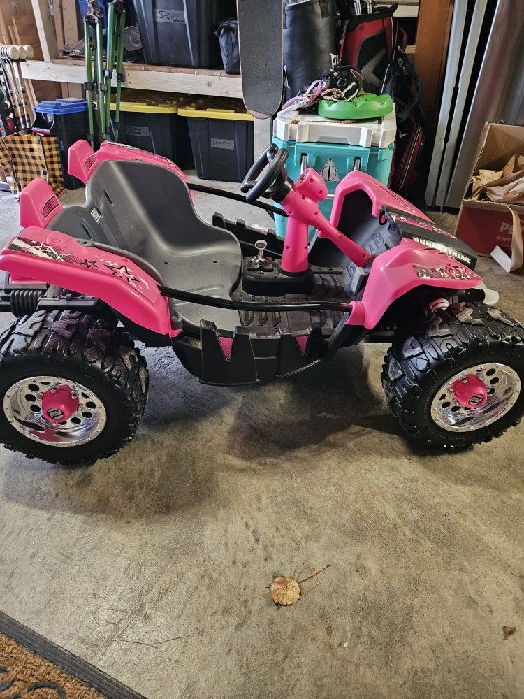 Pink Power Wheels Dune Racer Extreme, battery-powered ride-on, 12v. Max speed is 5mph. This is two years old, was a Santa gift for my daughter in 2023. This model isn't available anymore. I have a second battery too so this could be driven for 2-3hrs at a time. In great condition but Wheels show obvious wear since it has been used on neighborhood streets.