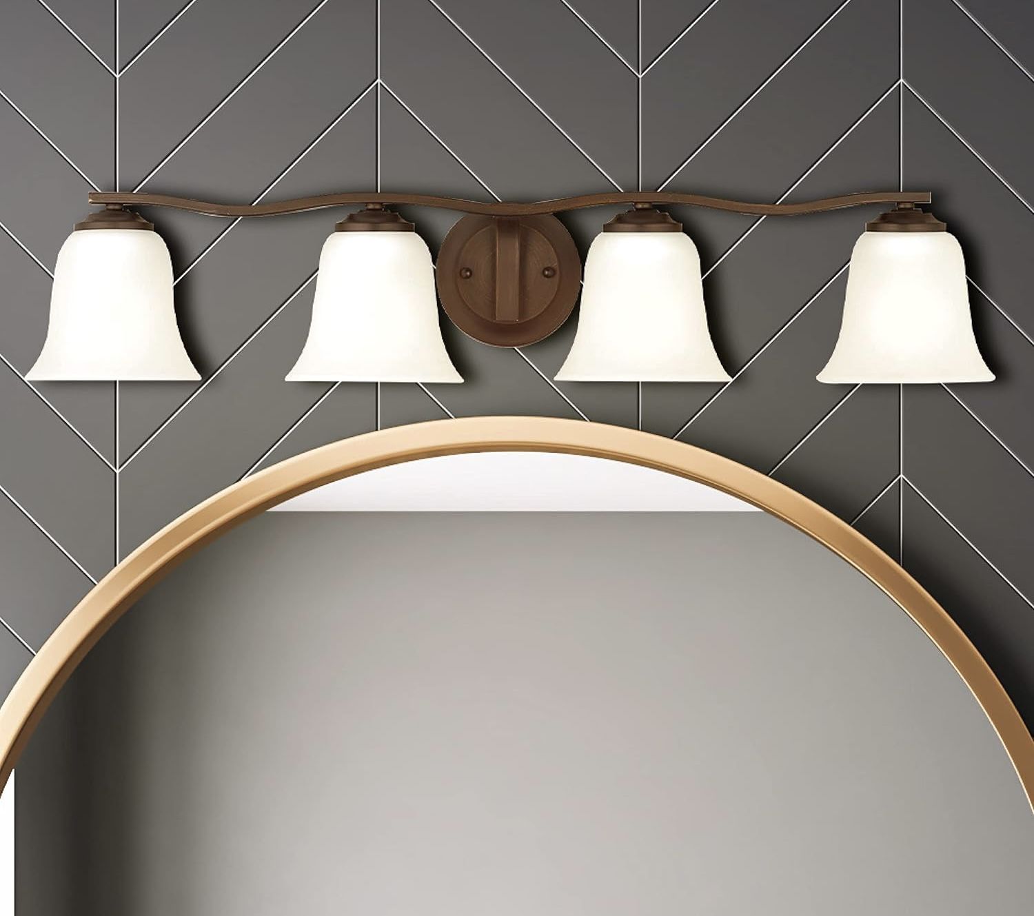 New Vanity Light - 4 Lights, Bronze, About 32” Long X 6.25” High, Satin Etched Glass Shades