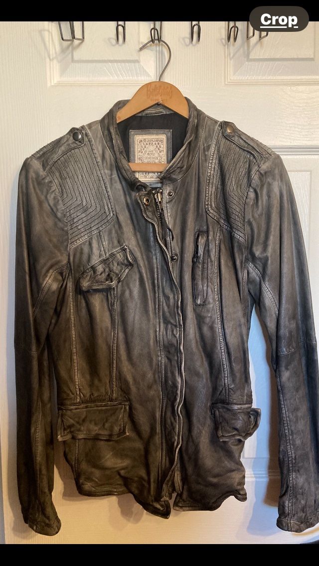 Ladies distressed gray leather jacket. Worn-in with love and in great condition. No damages or odors.