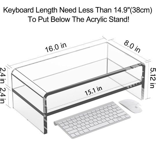 IF IT'S LISTED, IT'S AVAILABLE IN MESA AT VAL VISTA AND SOUTHERN/BROADWAY. 5inx16inx8in acrylic computer monitor riser/stand. 2 shelves. Specific measurements in pictures. No cracks.