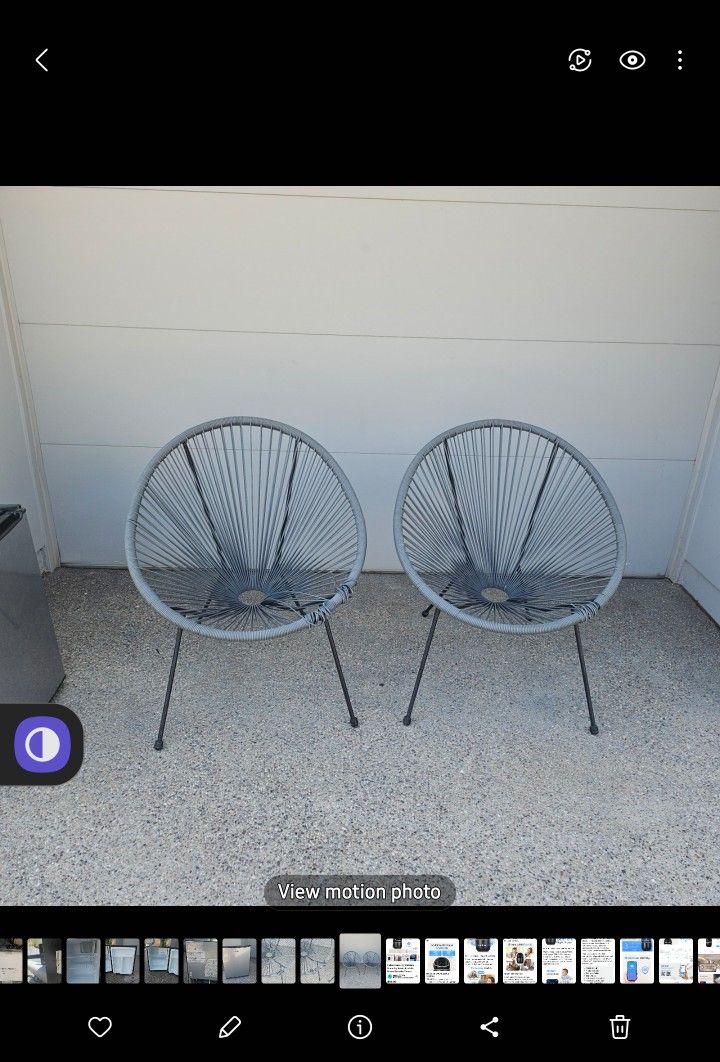 Both bistro chairs need some re- tying/ repair. Matching glass table is in good condition, no chips or cracks in glass.